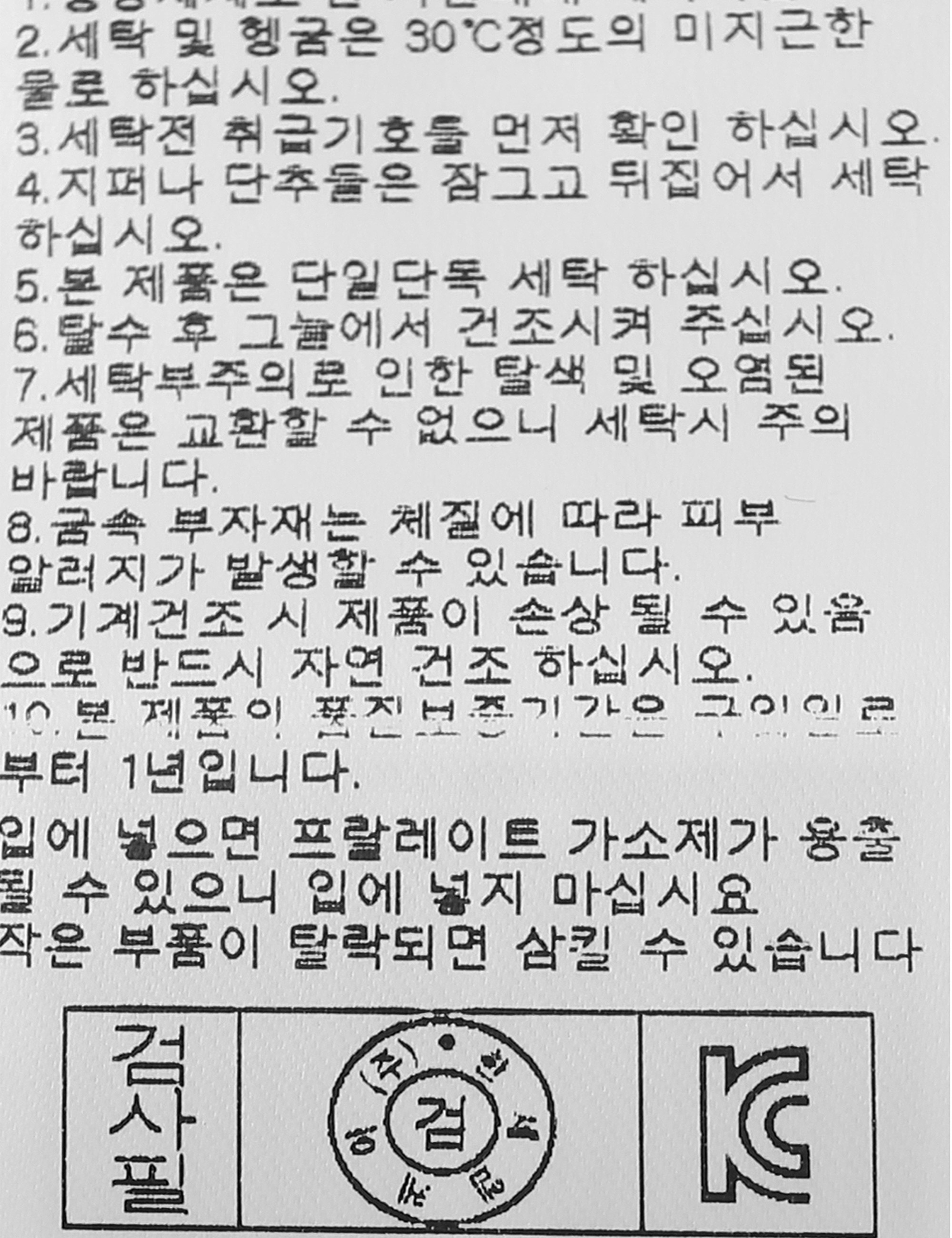 | 세탁방법 및 취급시 주의사항 | 본 제품은 손세탁 하십시오.(케어라벨참고) |