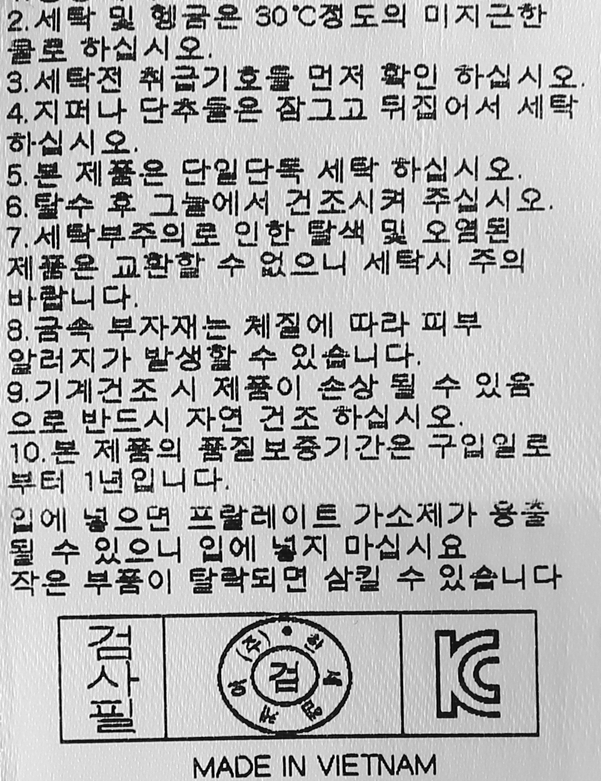 | 세탁방법 및 취급시 주의사항 | 본 제품은 손세탁 하십시오.(케어라벨참고) |