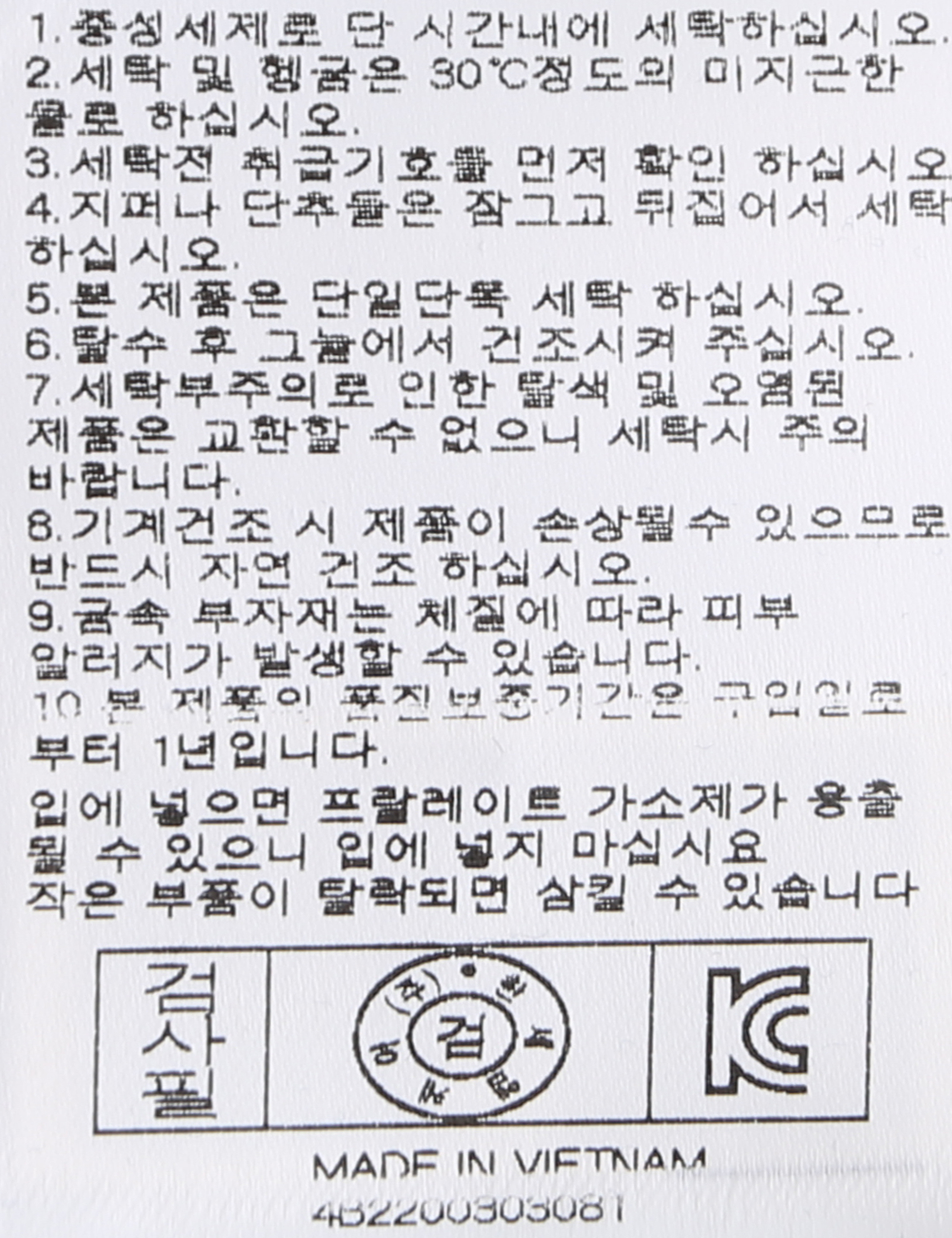 세탁방법 및 취급시 주의사항 중성세제로 단 시간내에 세탁하십시오.(케어라벨참고)