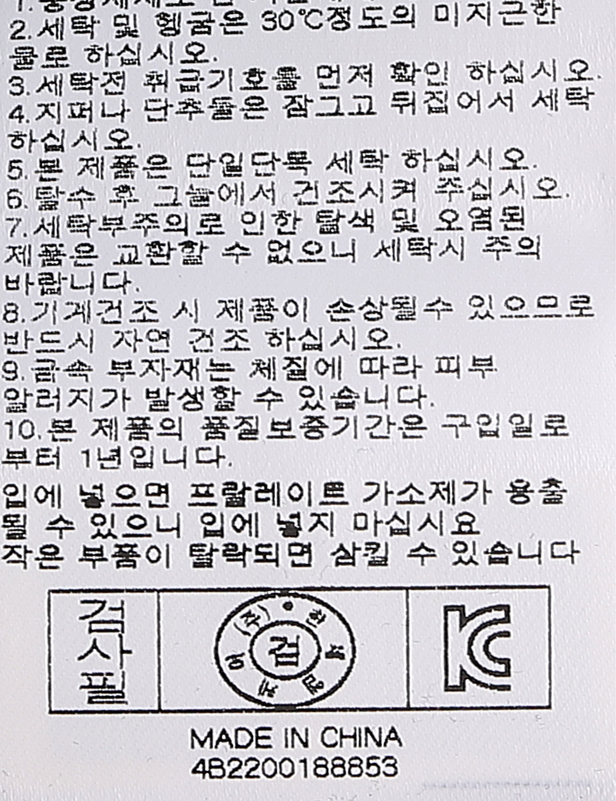 | 세탁방법 및 취급시 주의사항 | 중성세제로 단 시간내에 세탁하십시오.(케어라벨참고) |