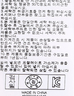 | 세탁방법 및 취급시 주의사항 | 중성세제로 단 시간내에 세탁하십시오.(케어라벨참고) |