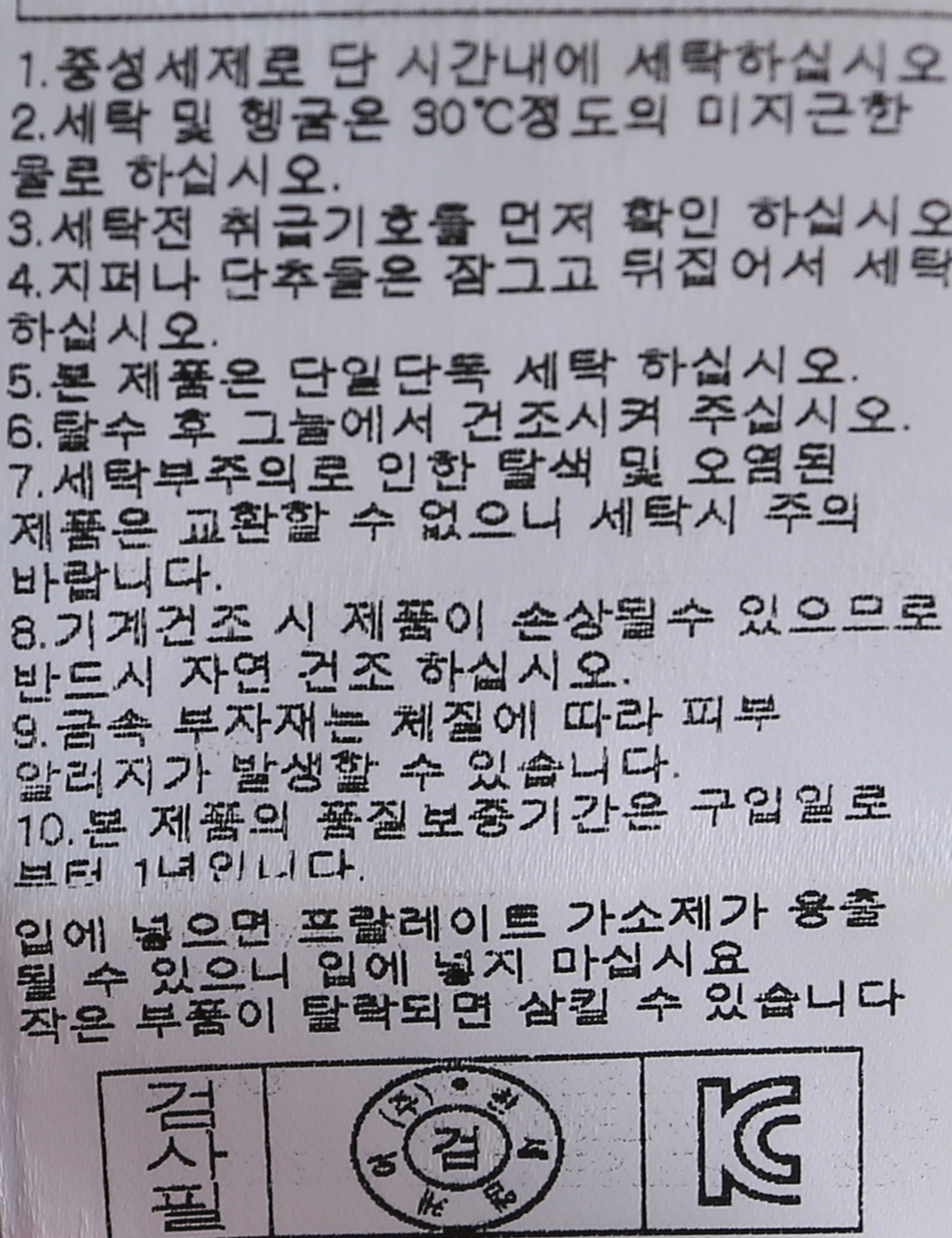 | 세탁방법 및 취급시 주의사항 | 중성세제로 단 시간내에 세탁하십시오.(케어라벨참고) |