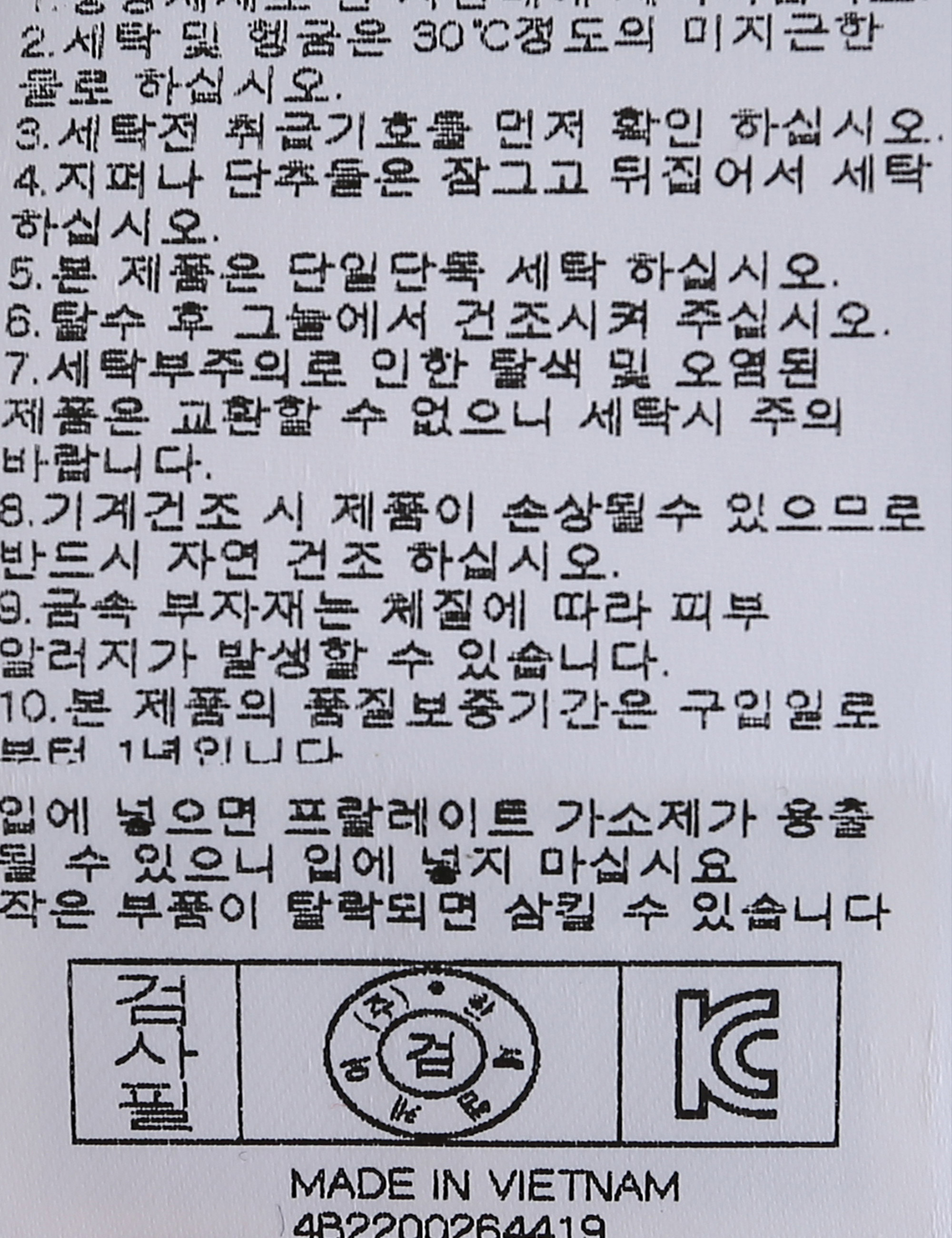 | 세탁방법 및 취급시 주의사항 | 중성세제로 단 시간내에 세탁하십시오.(케어라벨참고) |