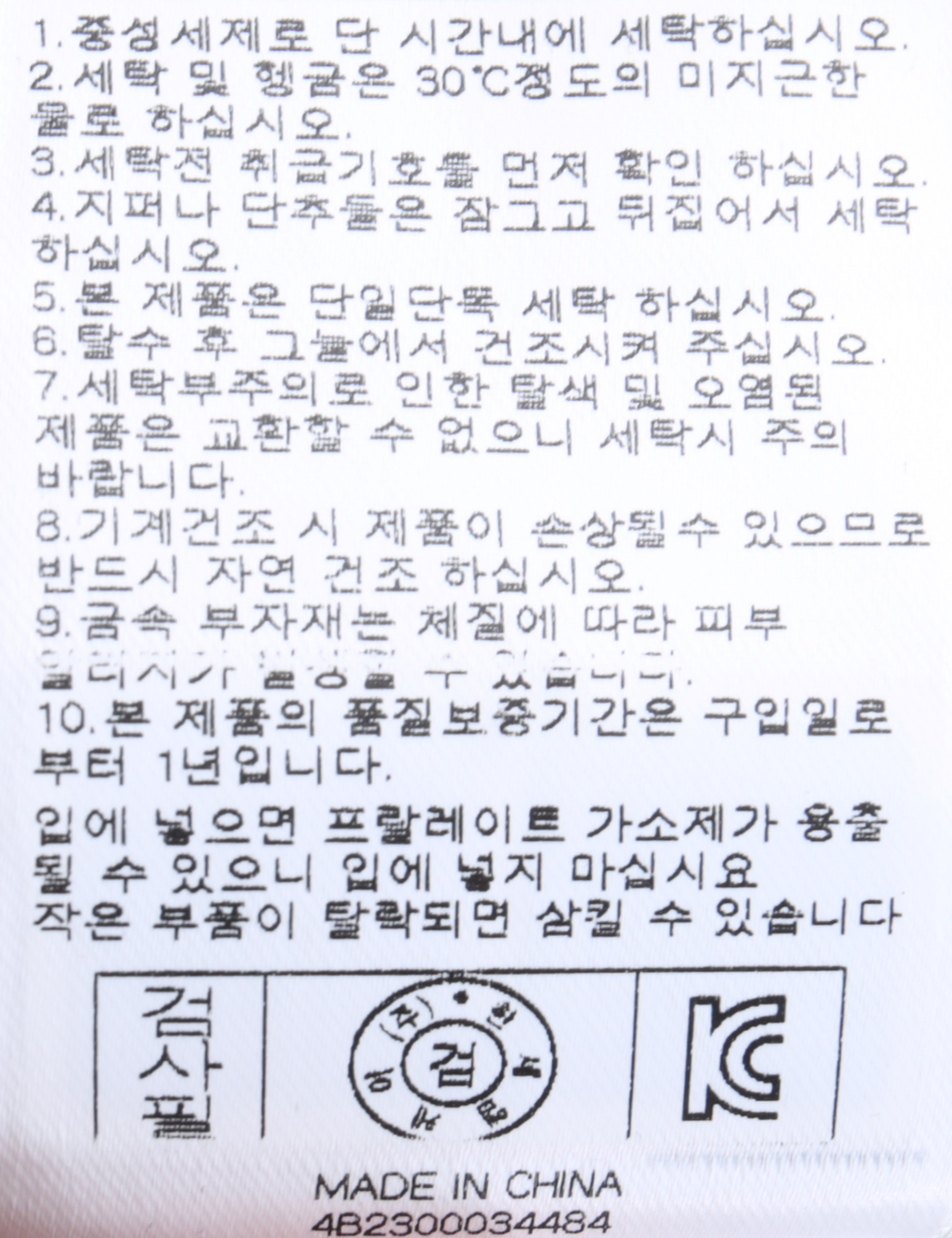 | 세탁방법 및 취급시 주의사항 | 중성세제로 단 시간내에 세탁하십시오.(케어라벨참고) |