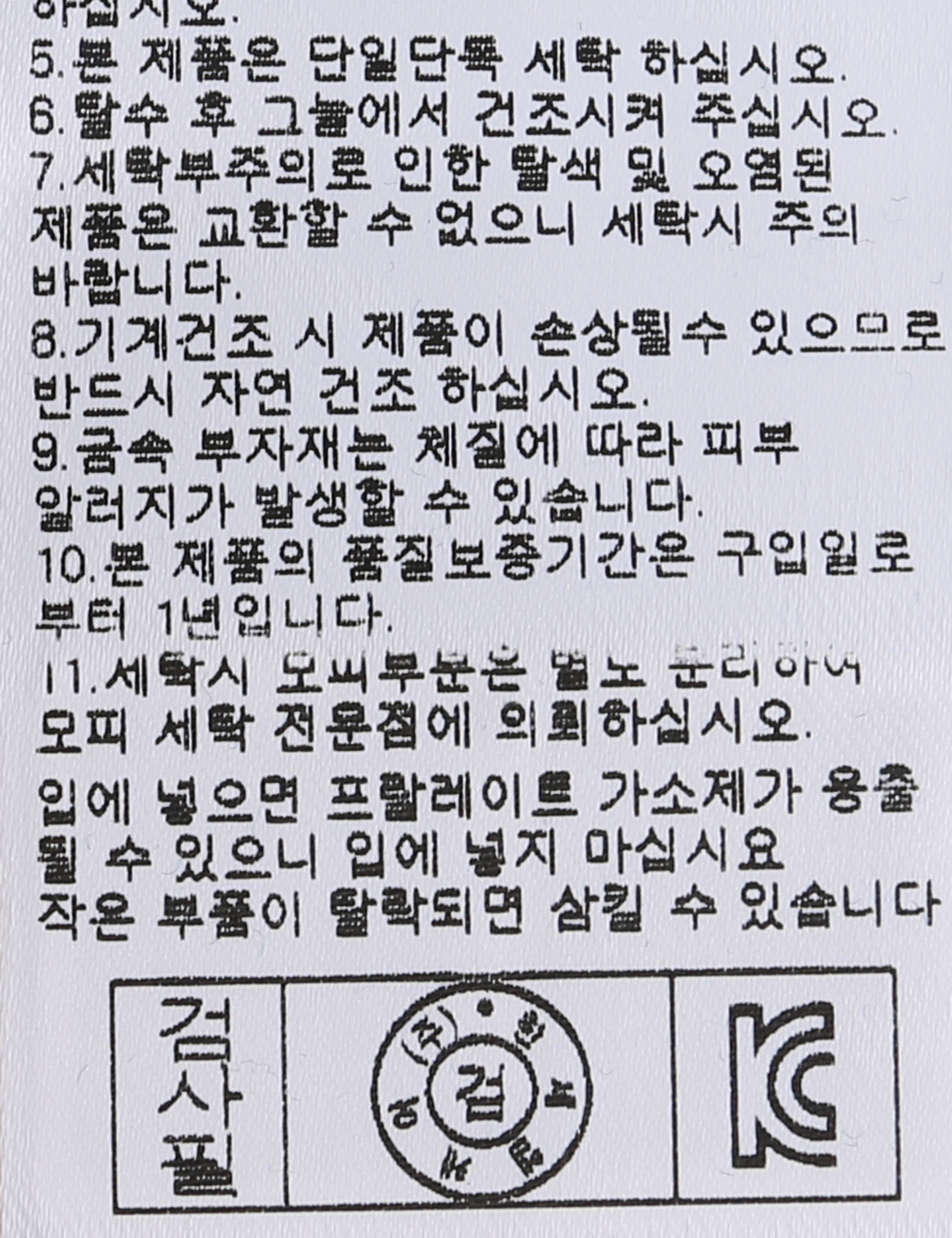 | 세탁방법 및 취급시 주의사항 | 중성세제로 단 시간내에 세탁하십시오.(케어라벨참고) |