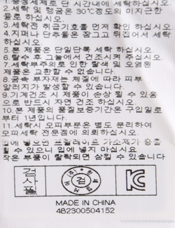 | 세탁방법 및 취급시 주의사항 | 본 제품은 손세탁 하십시오.(케어라벨참고) |