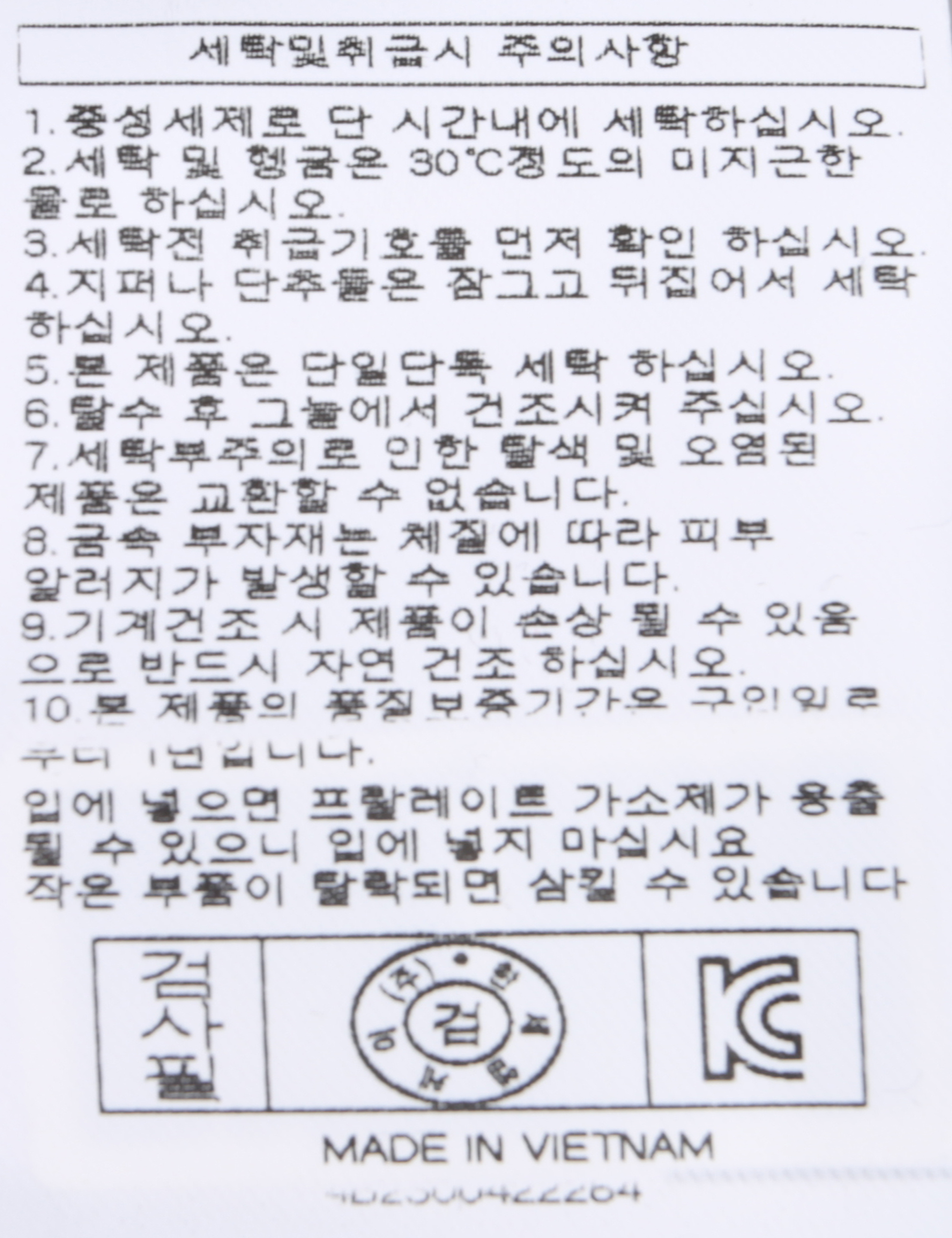 | 세탁방법 및 취급시 주의사항 | 본 제품은 손세탁 하십시오.(케어라벨참고) |