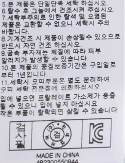 | 세탁방법 및 취급시 주의사항 | 중성세제로 단 시간내에 세탁하십시오.(케어라벨참고) |