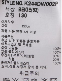 제품소재 [겉감]나일론100% [안감]폴리에스터100% [충전재1]우모(오리)솜털80% 깃털20% [충전재2]폴리에스터100%