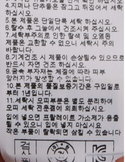 세탁방법 및 취급시 주의사항 본 제품은 손세탁 하십시오.(케어라벨참고)