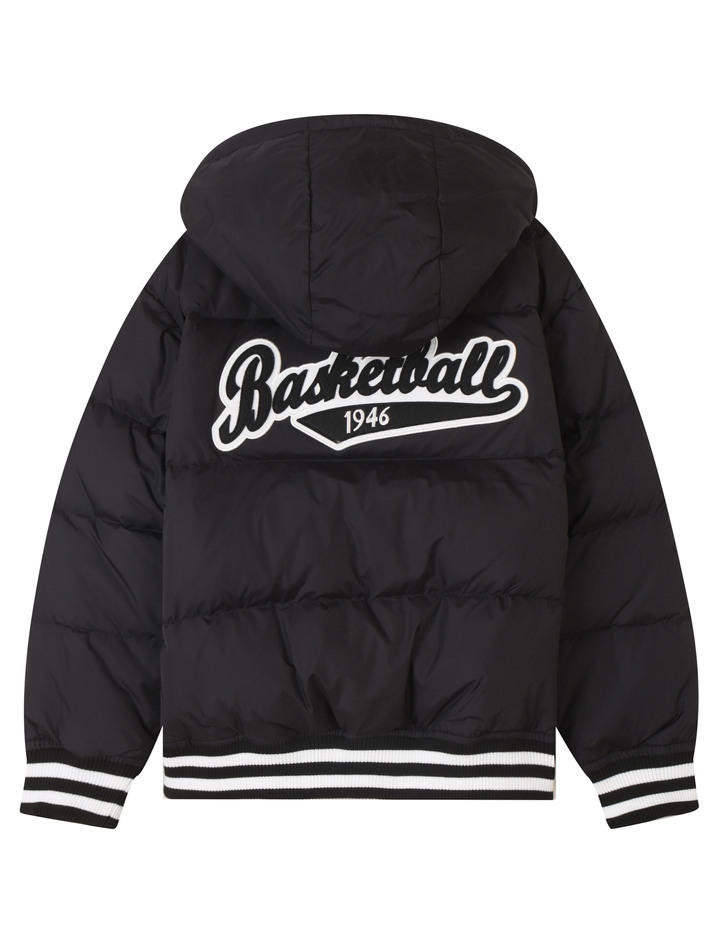 -꾸준히 판매율이 좋은 바시티점퍼 유형을 다운아이템에 적용한 아이템으로 뒷판에 들어간 필기체 느낌의 아트웍이 포인트