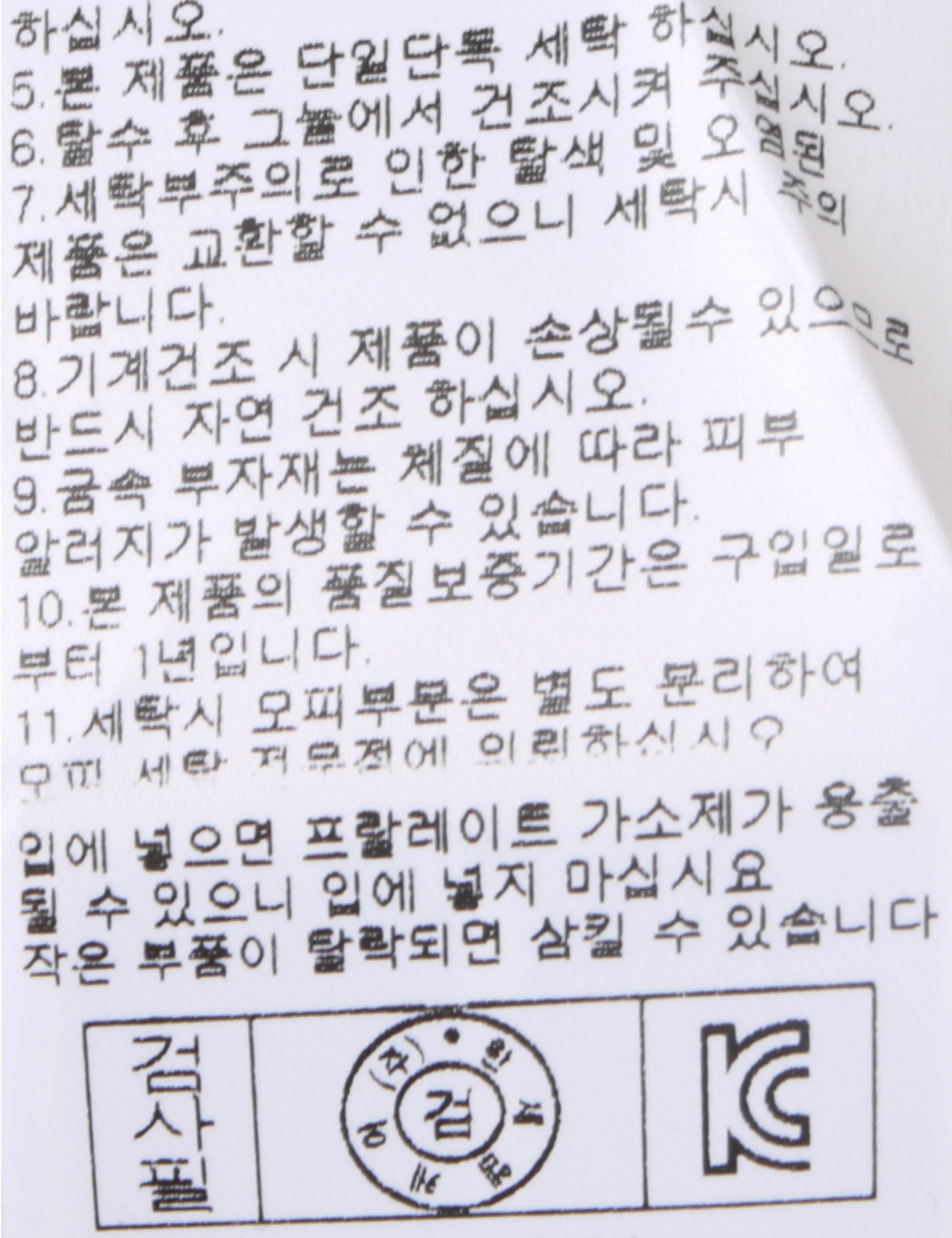 | 세탁방법 및 취급시 주의사항 | 중성세제로 단 시간내에 세탁하십시오.(케어라벨참고) |