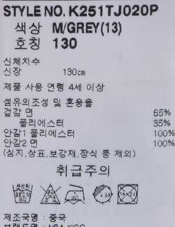 브랜드 홈 바로가기| 제품소재 | [겉감]면65% 폴리에스터35% [안감1]폴리에스터100% [안감2]면100% |