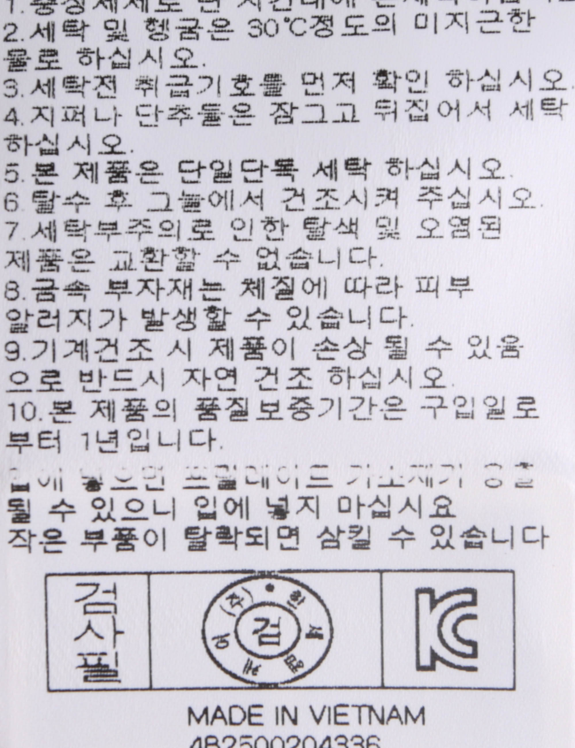 세탁방법 및 취급시 주의사항 본 제품은 손세탁 하십시오.(케어라벨참고)