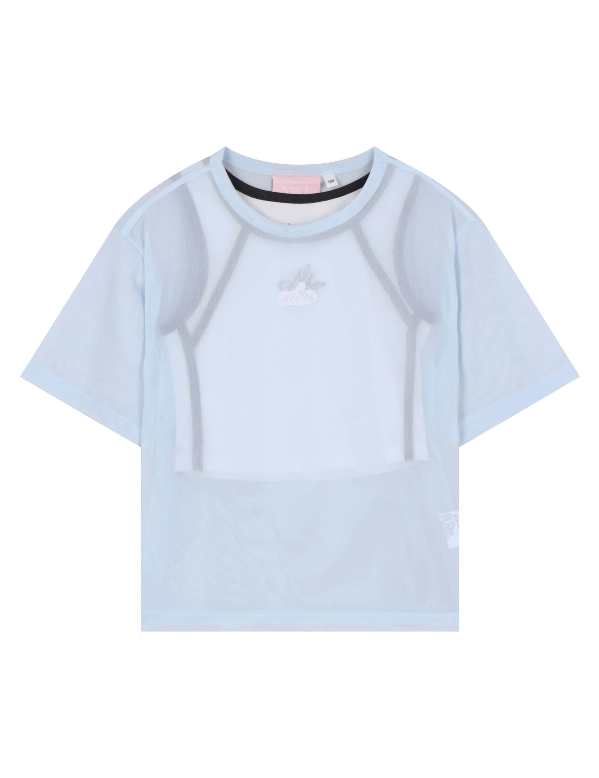 -얇은 메쉬스판 소재의 박시한 반팔아 이템과 핏되는 나시 티셔츠 아이템을 레이어드 해서 입을 수 있는 아이템