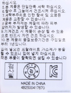 | 세탁방법 및 취급시 주의사항 | 본 제품은 손세탁 하십시오.(케어라벨참고) |