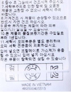 | 세탁방법 및 취급시 주의사항 | 본 제품은 손세탁 하십시오.(케어라벨참고) |
