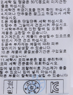 | 세탁방법 및 취급시 주의사항 | 본 제품은 손세탁 하십시오.(케어라벨참고) |