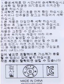 | 세탁방법 및 취급시 주의사항 | 본 제품은 손세탁 하십시오.(케어라벨참고) |