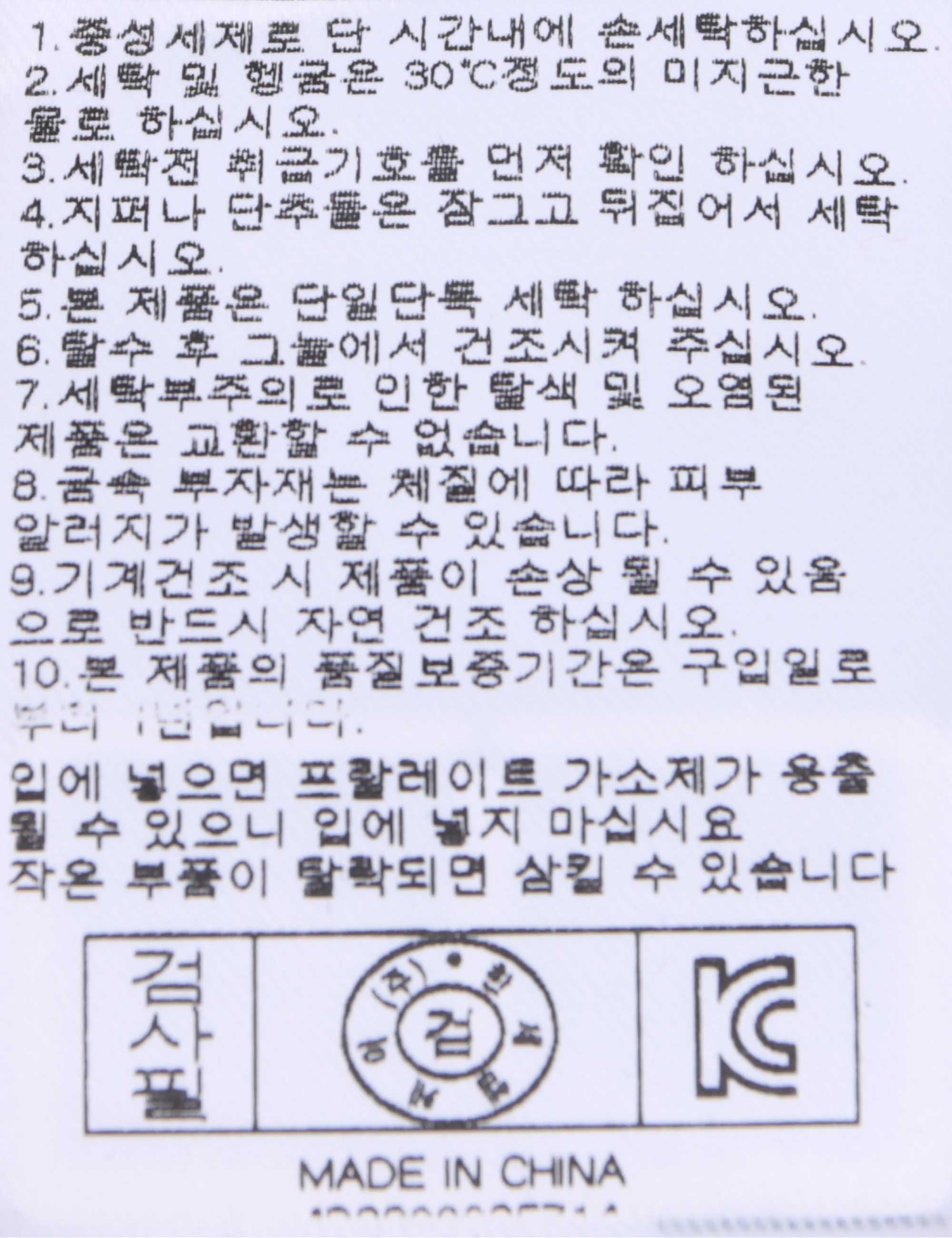 | 세탁방법 및 취급시 주의사항 | 본 제품은 손세탁 하십시오.(케어라벨참고) |
