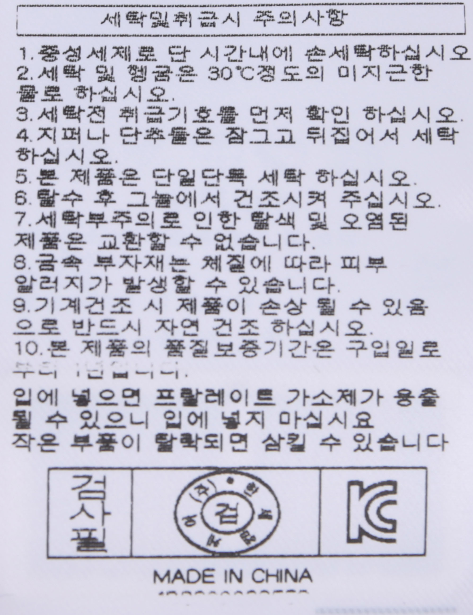 | 세탁방법 및 취급시 주의사항 | 본 제품은 손세탁 하십시오.(케어라벨참고) |