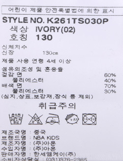 제품소재 [겉감]면60% 폴리에스터40% [배색]면70% 폴리에스터30%