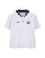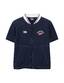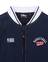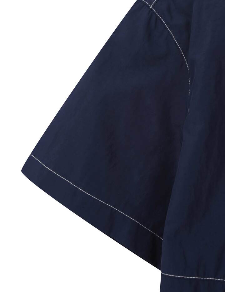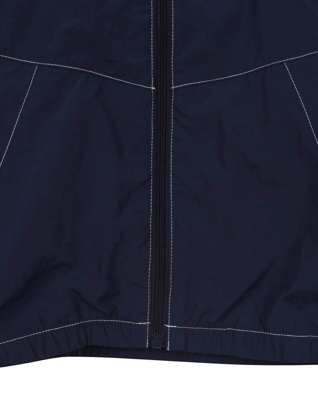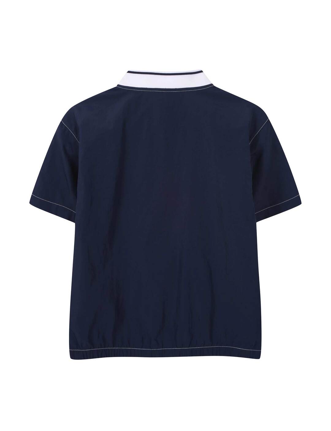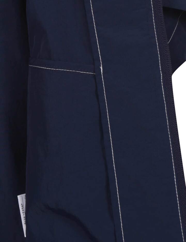 가벼운 나일론 100% 소재의 바시티형 반소매 바람막이로, 배색 스티치 장식과 양쪽 로고 자수가 돋보이는 유니크한 홑겹 아우터