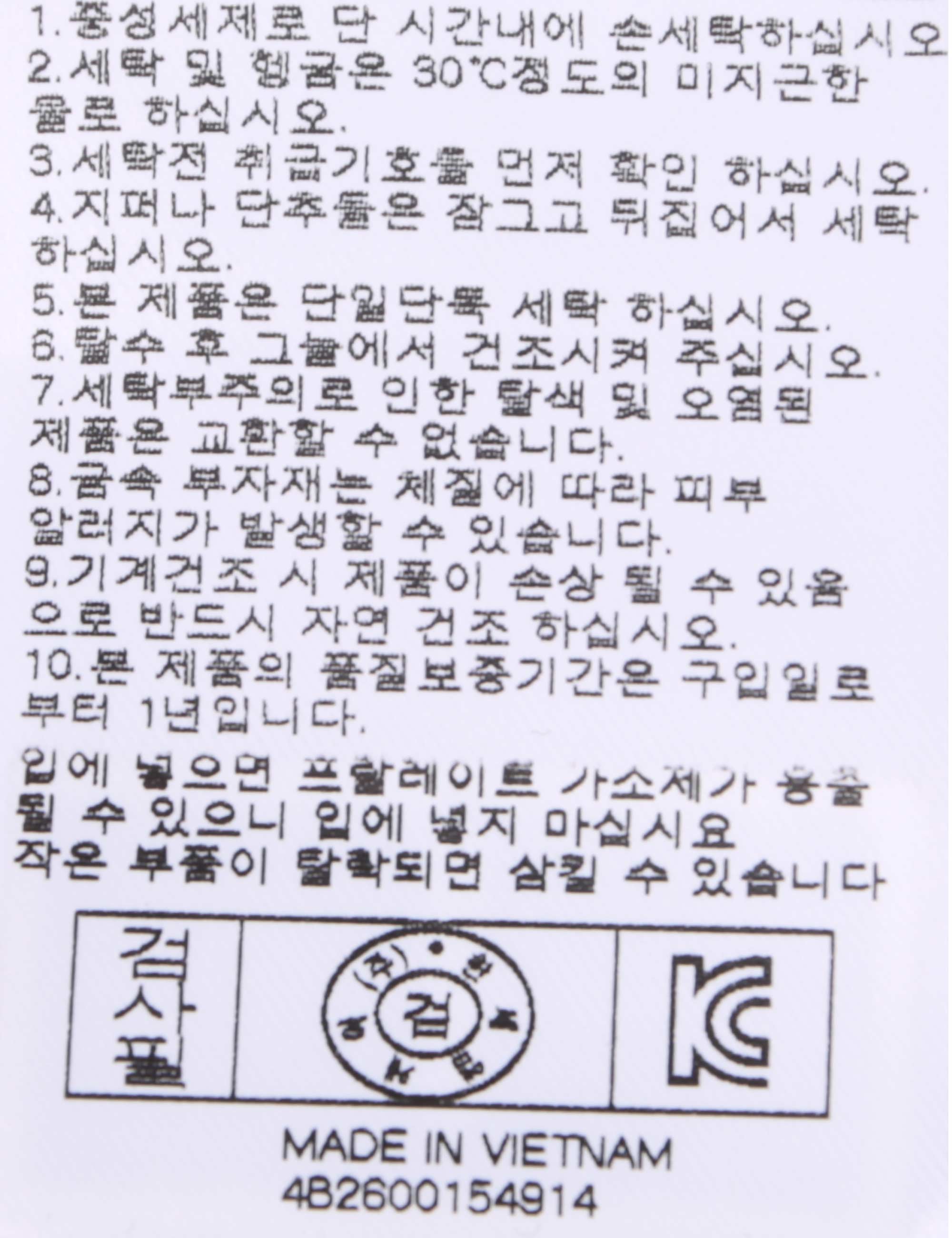 | 세탁방법 및 취급시 주의사항 | 본 제품은 손세탁 하십시오.(케어라벨참고) |