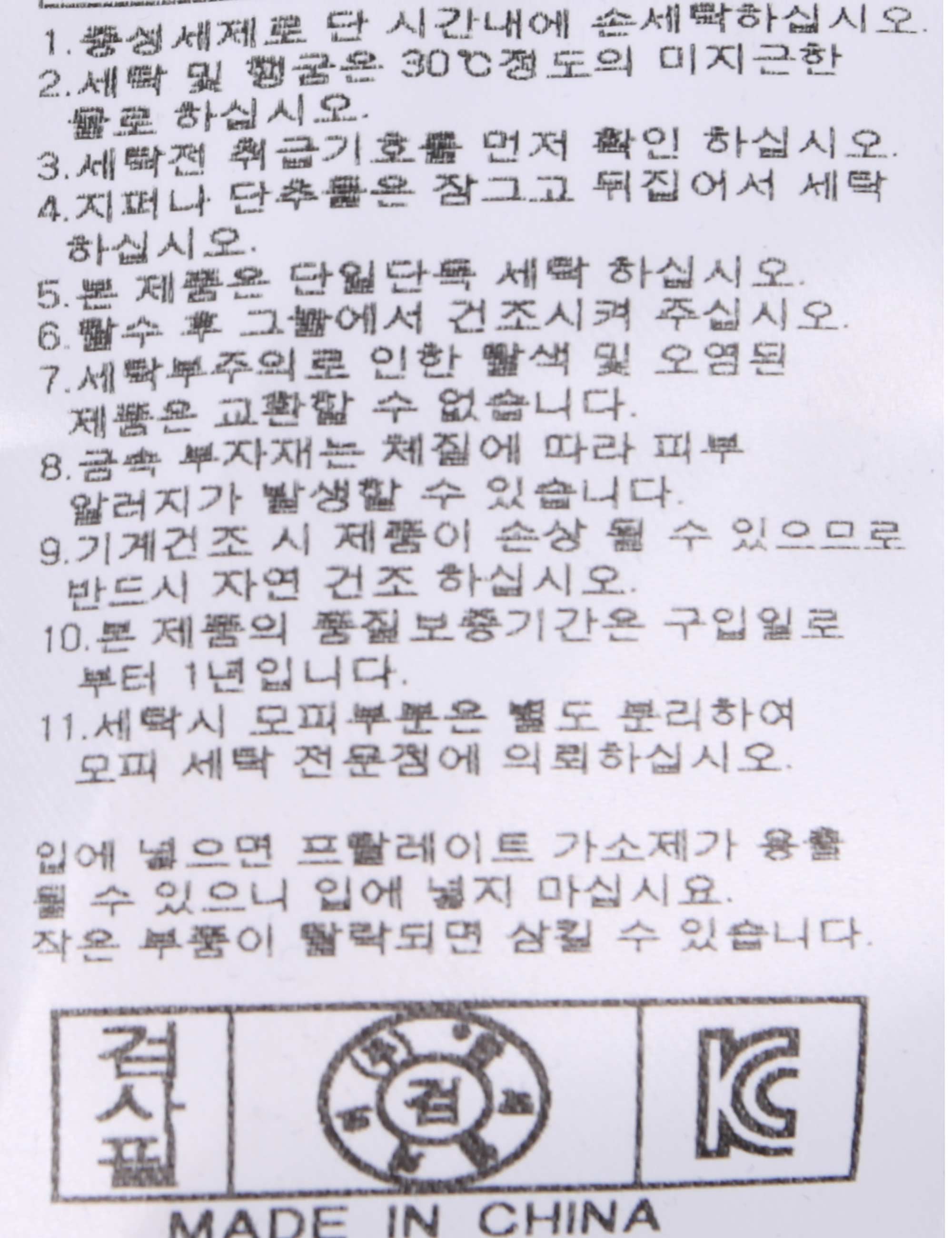 | 세탁방법 및 취급시 주의사항 | 본 제품은 손세탁 하십시오.(케어라벨참고) |