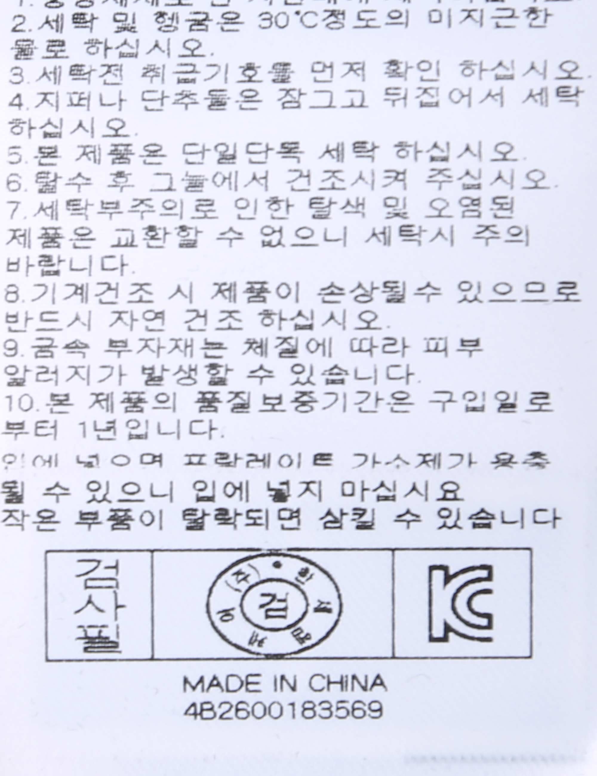 | 세탁방법 및 취급시 주의사항 | 중성세제로 단 시간내에 세탁하십시오.(케어라벨참고) |