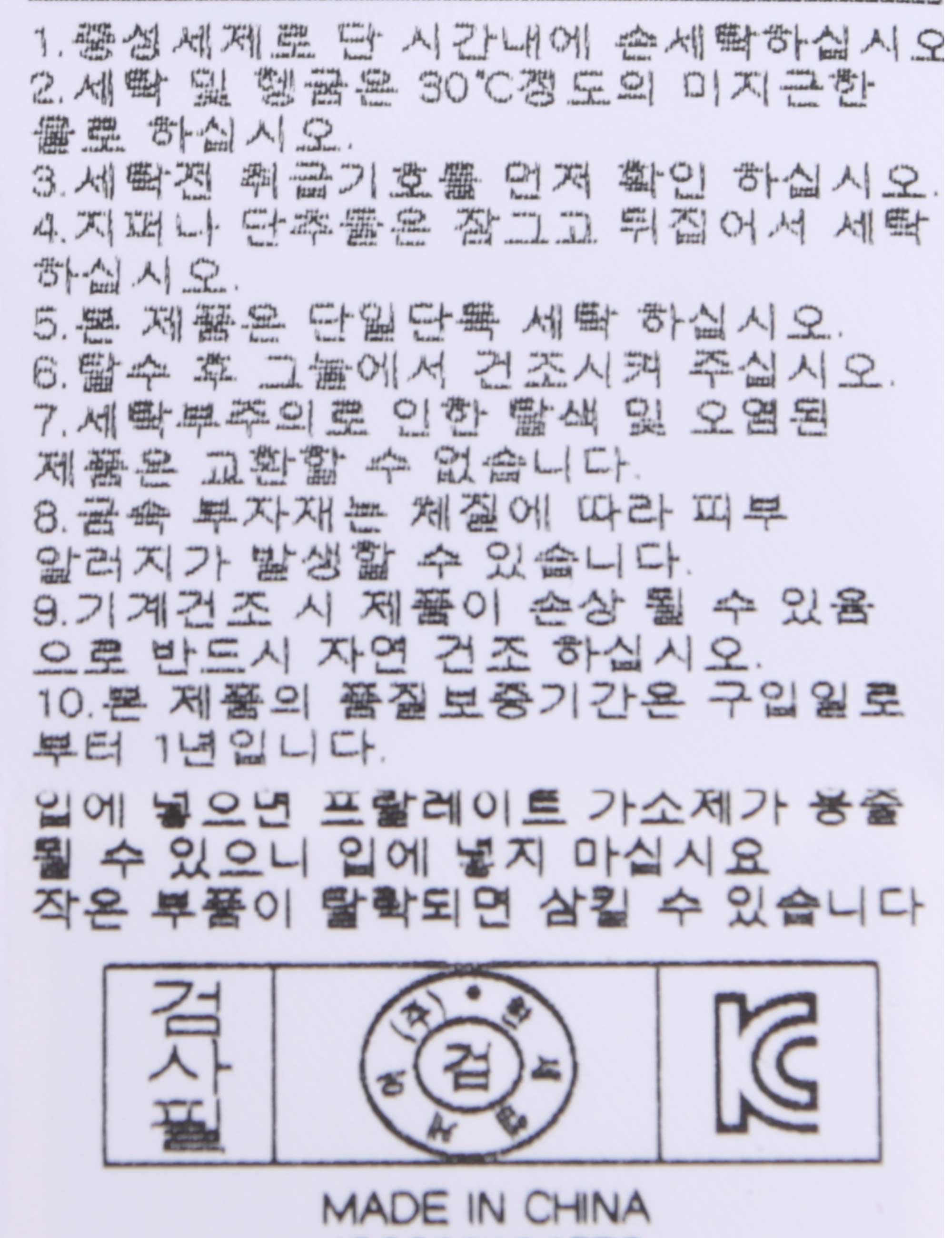 | 세탁방법 및 취급시 주의사항 | 본 제품은 손세탁 하십시오.(케어라벨참고) |