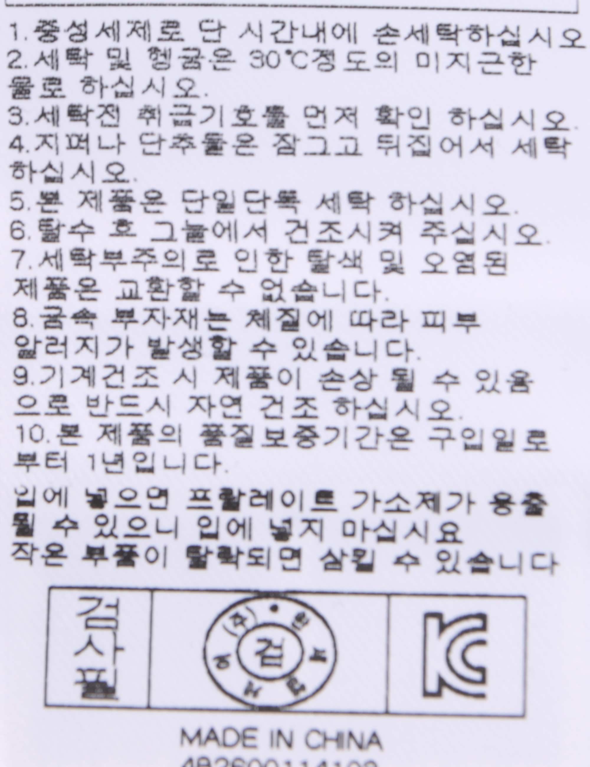 | 세탁방법 및 취급시 주의사항 | 본 제품은 손세탁 하십시오.(케어라벨참고) |