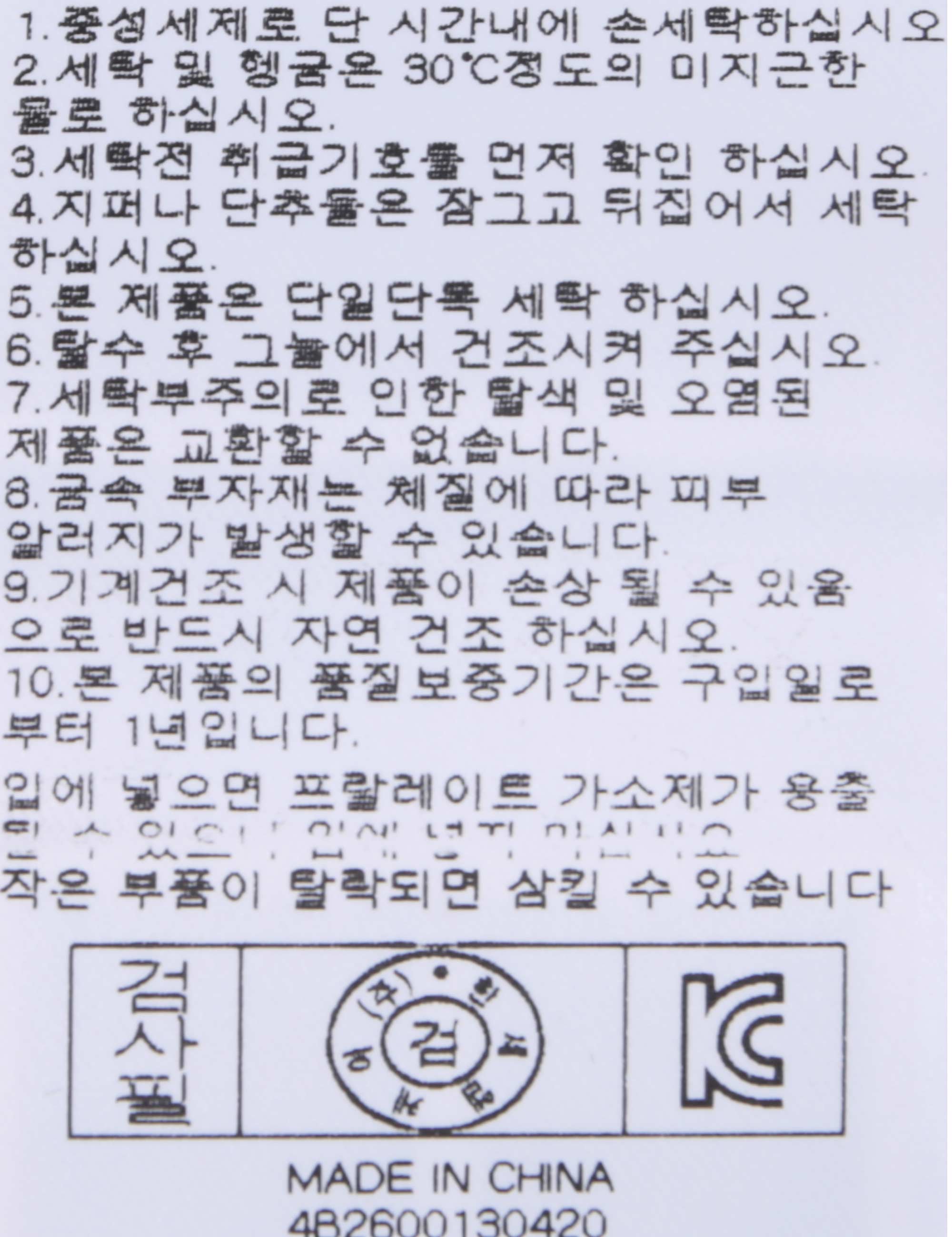| 세탁방법 및 취급시 주의사항 | 본 제품은 손세탁 하십시오.(케어라벨참고) |