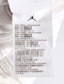 제품소재 (겉감/안감/후드충전재)폴리에스터100%(후드충전재)오리털(함유량90%)