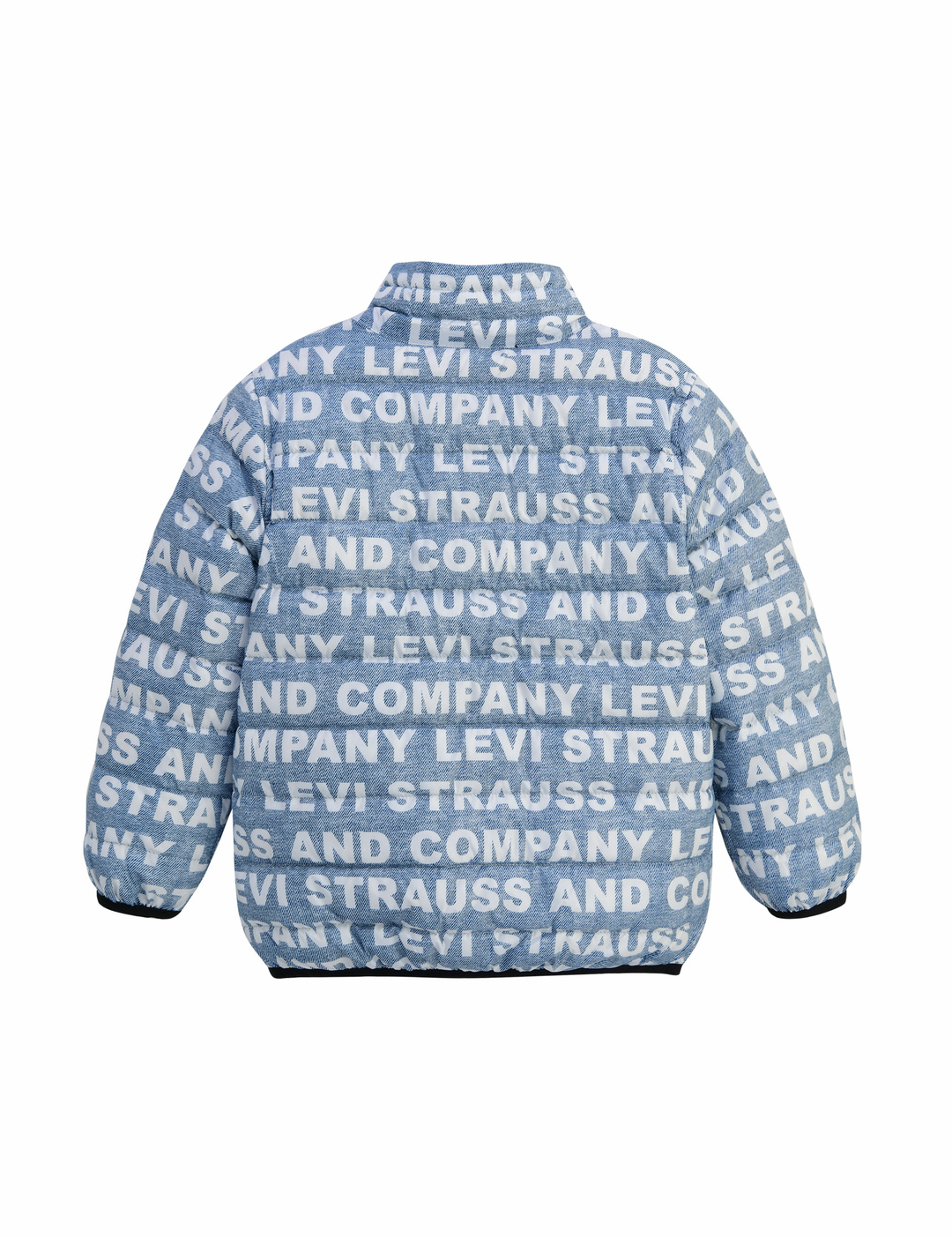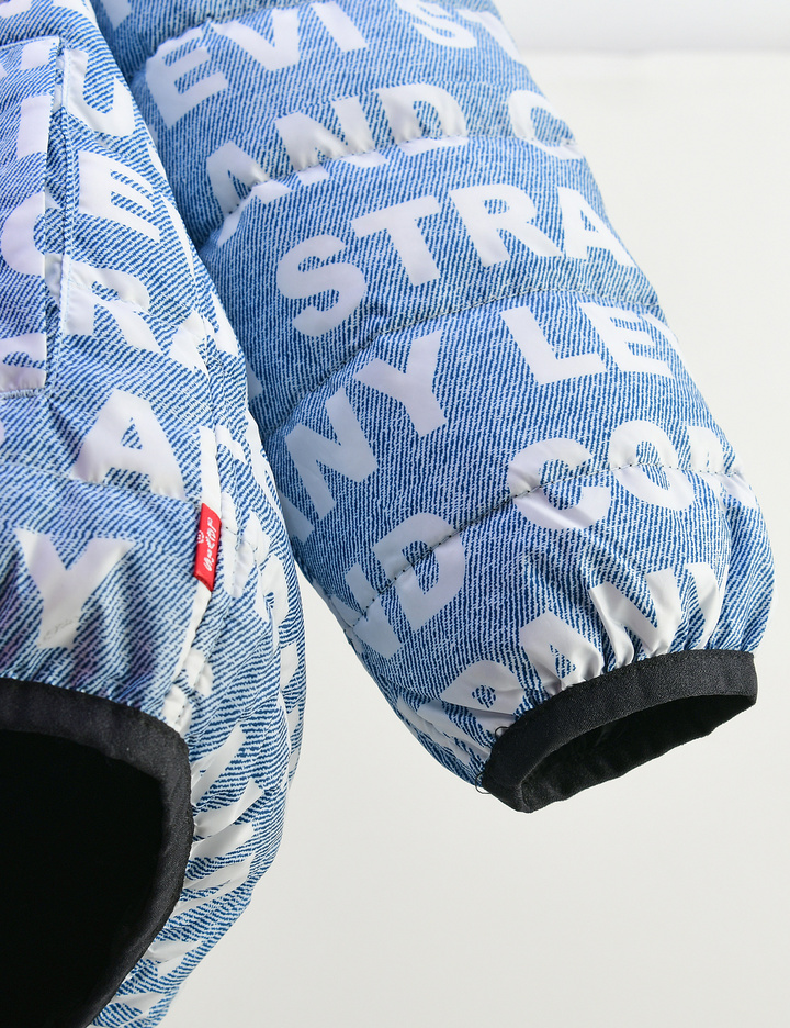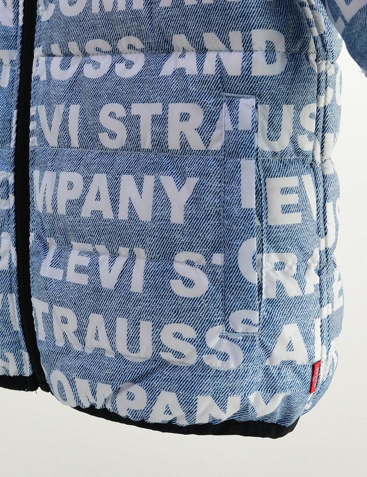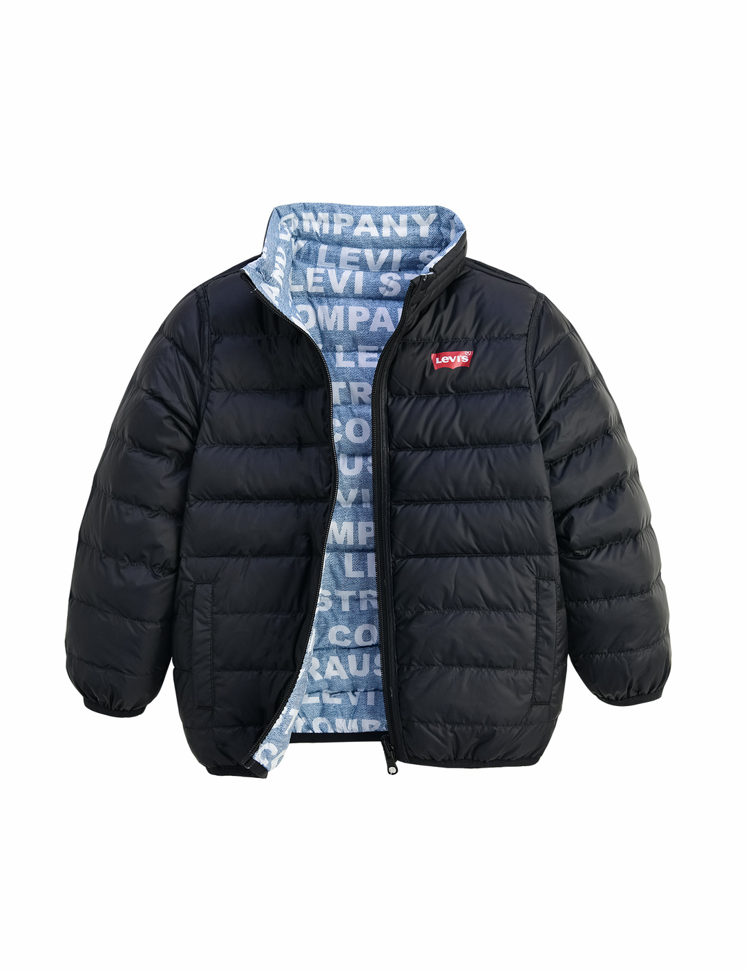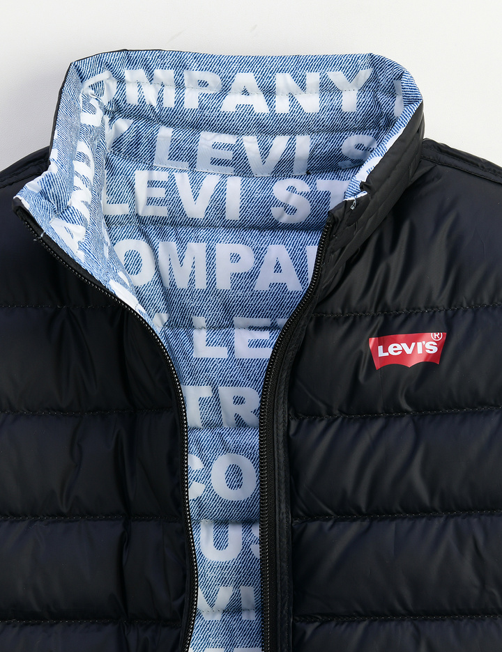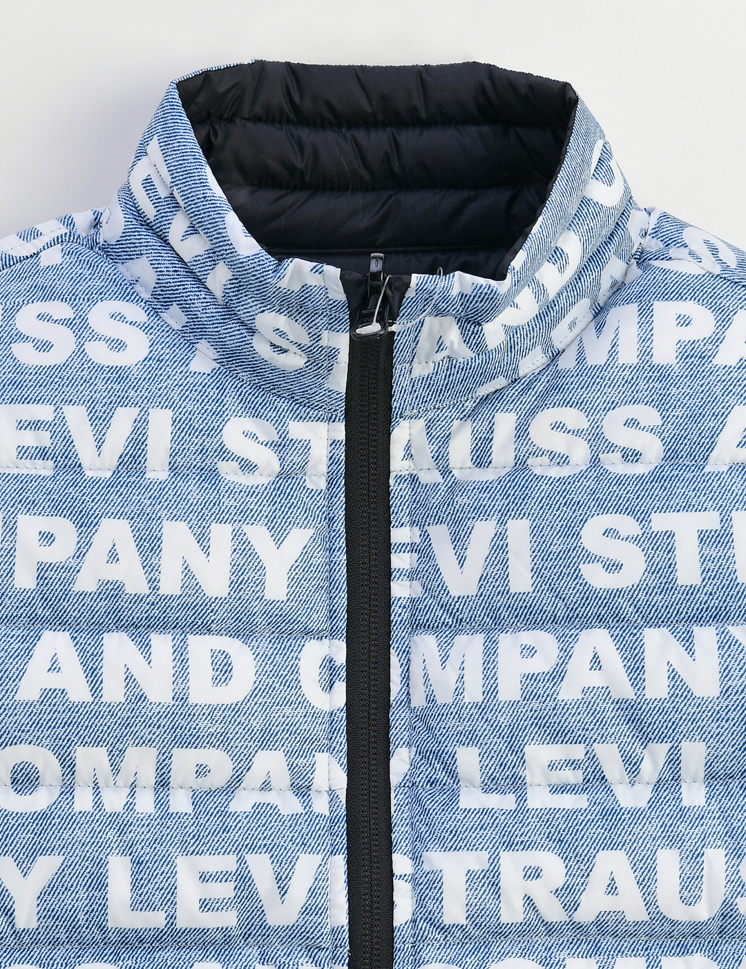 한쪽은 블랙 솔리드, 다른 한 면은올오버 프린트로 되어 양면으로 착용이 가능한 경량 다운 퀼팅 자켓
