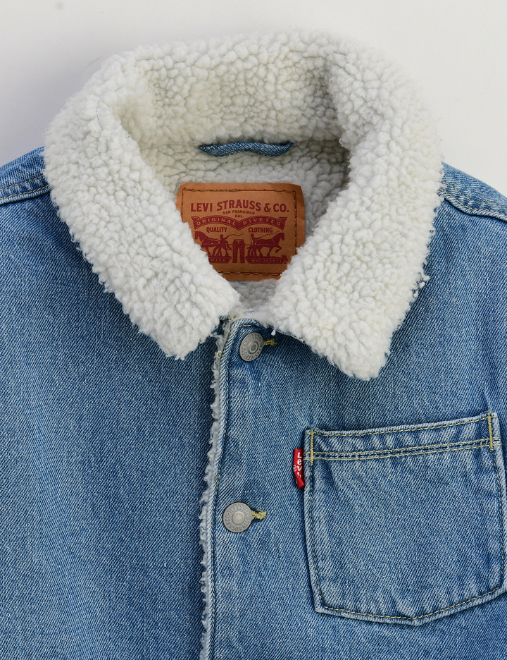 부드러운 셰르파 안감이 카라와 몸판에 들어가 있고, 스냅버튼 여밈으로 된 가벼운 겨울 트러커