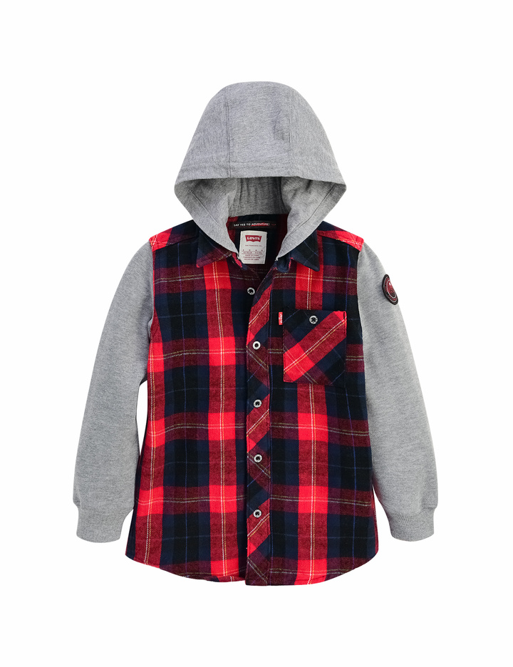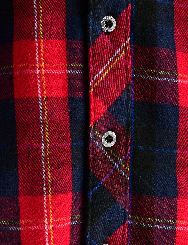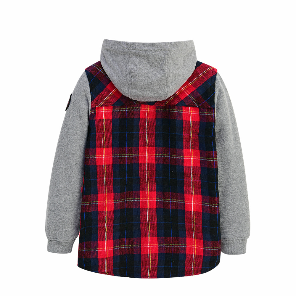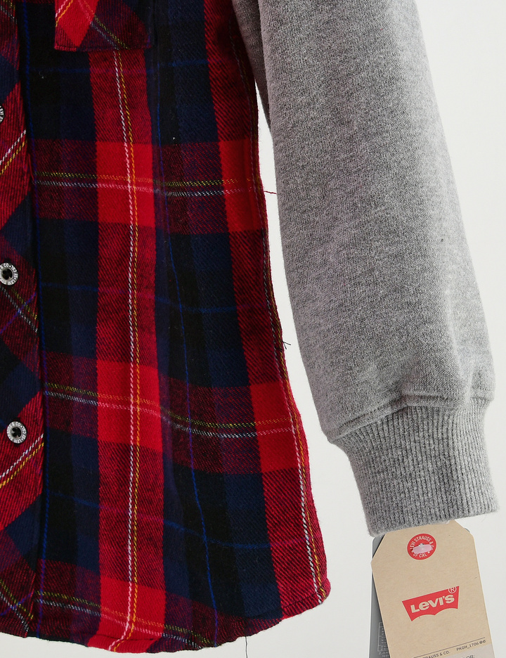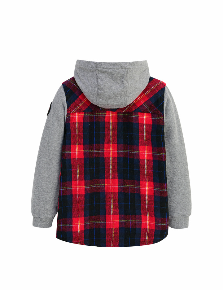 플라넬 소재 체크프린트 몸판에 플리스 소재 소매로 되어 있는 겨울용 자켓형 셔츠
