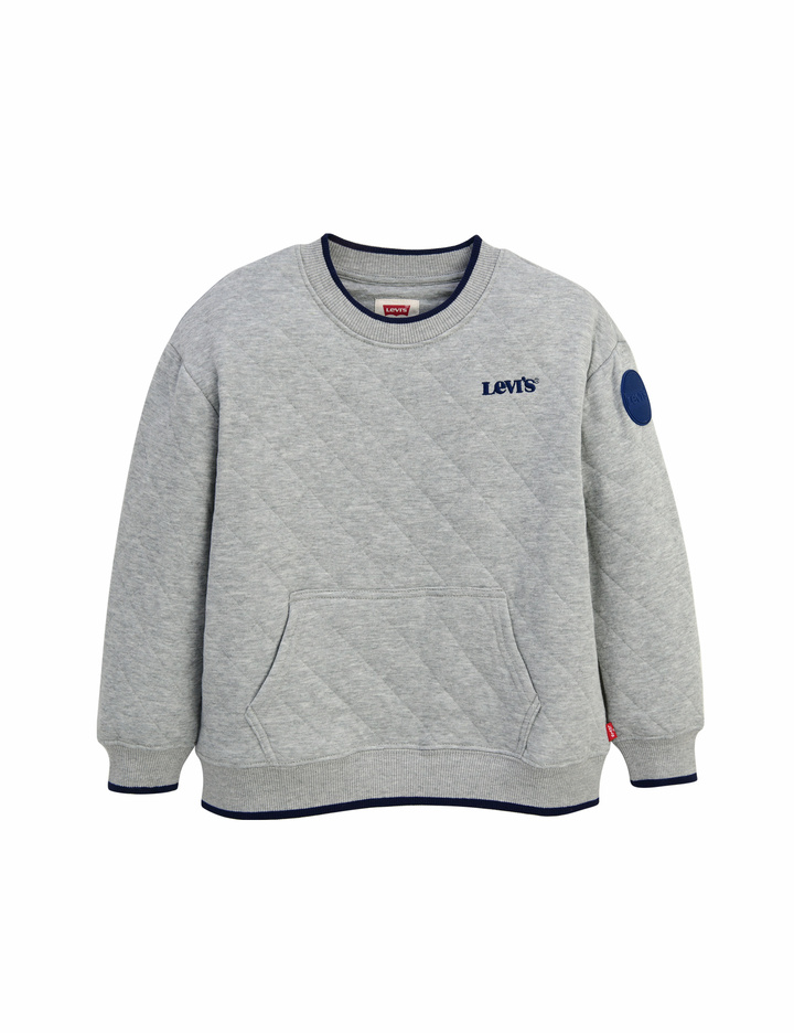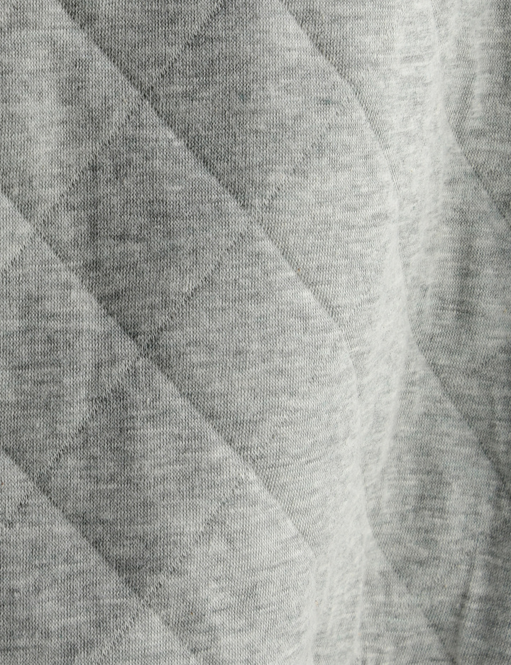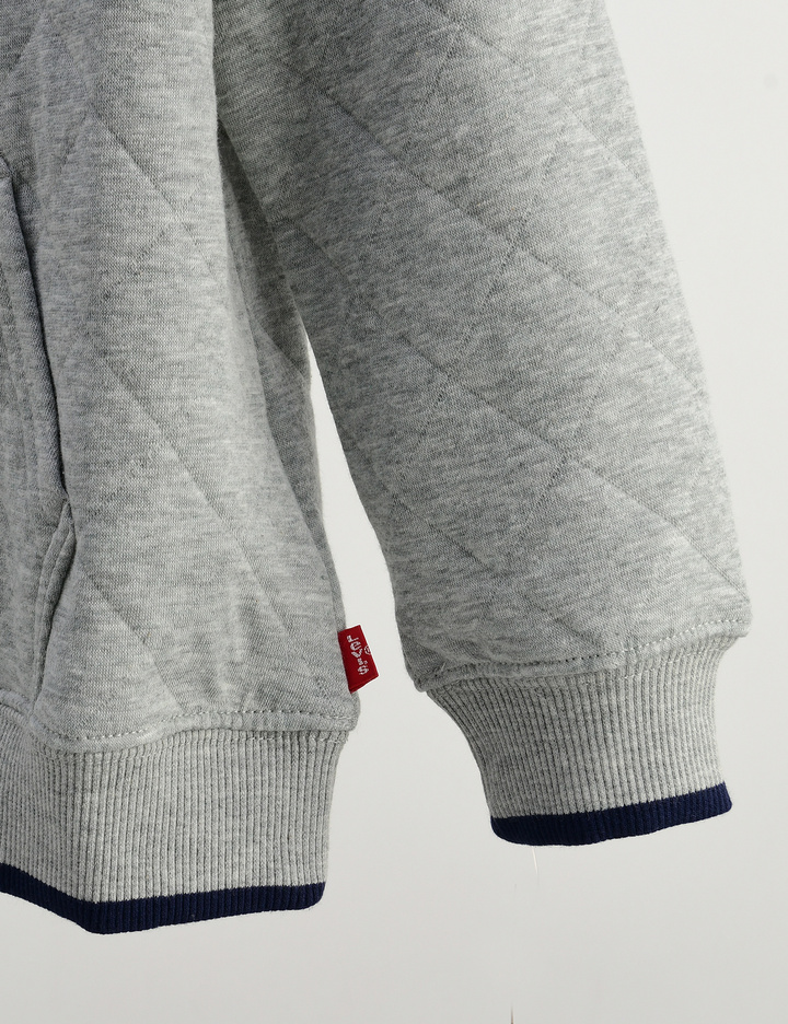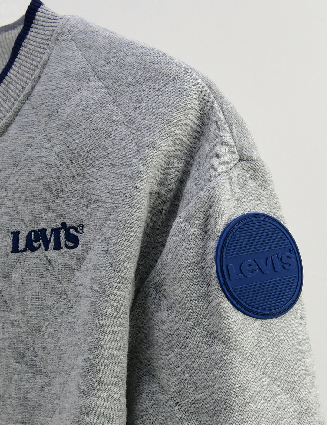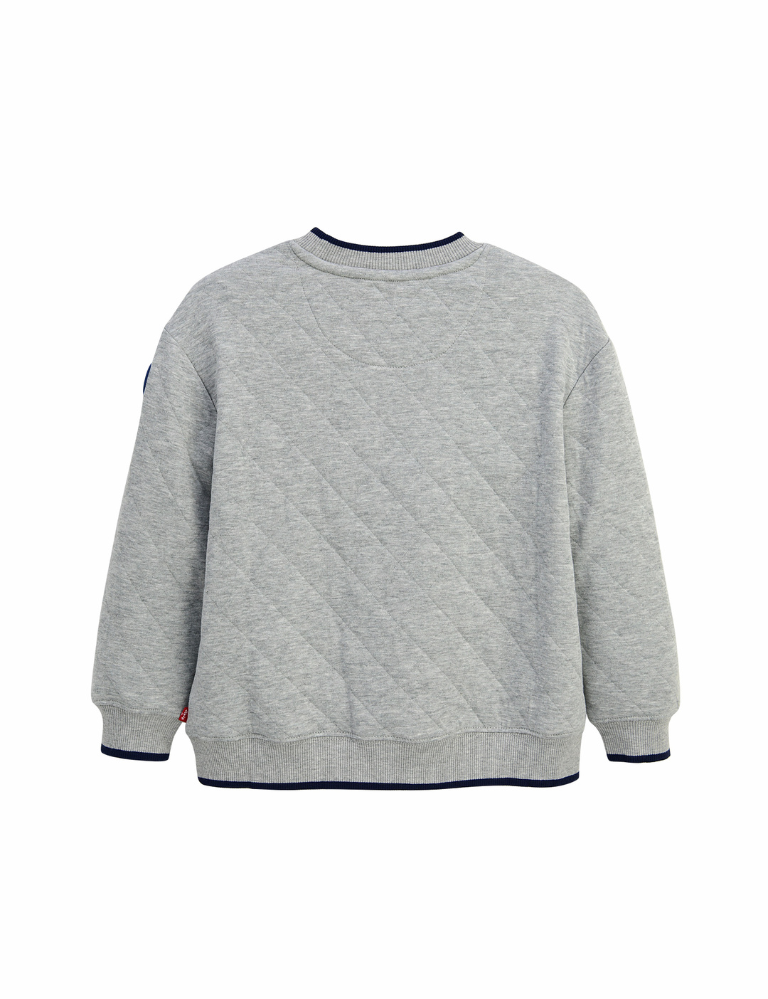 몸판에 퀼팅이 들어가 있으며, 소매위 실리콘 패치와 가슴 자수 로고가 포인트인 풀오버