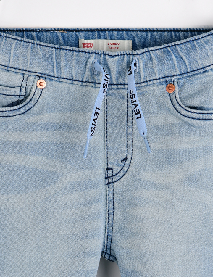 허리 조절이 가능한 여밈끈이 있으며, 허리 밴딩으로 편안한 스키니테이퍼 핏의 데님 팬츠