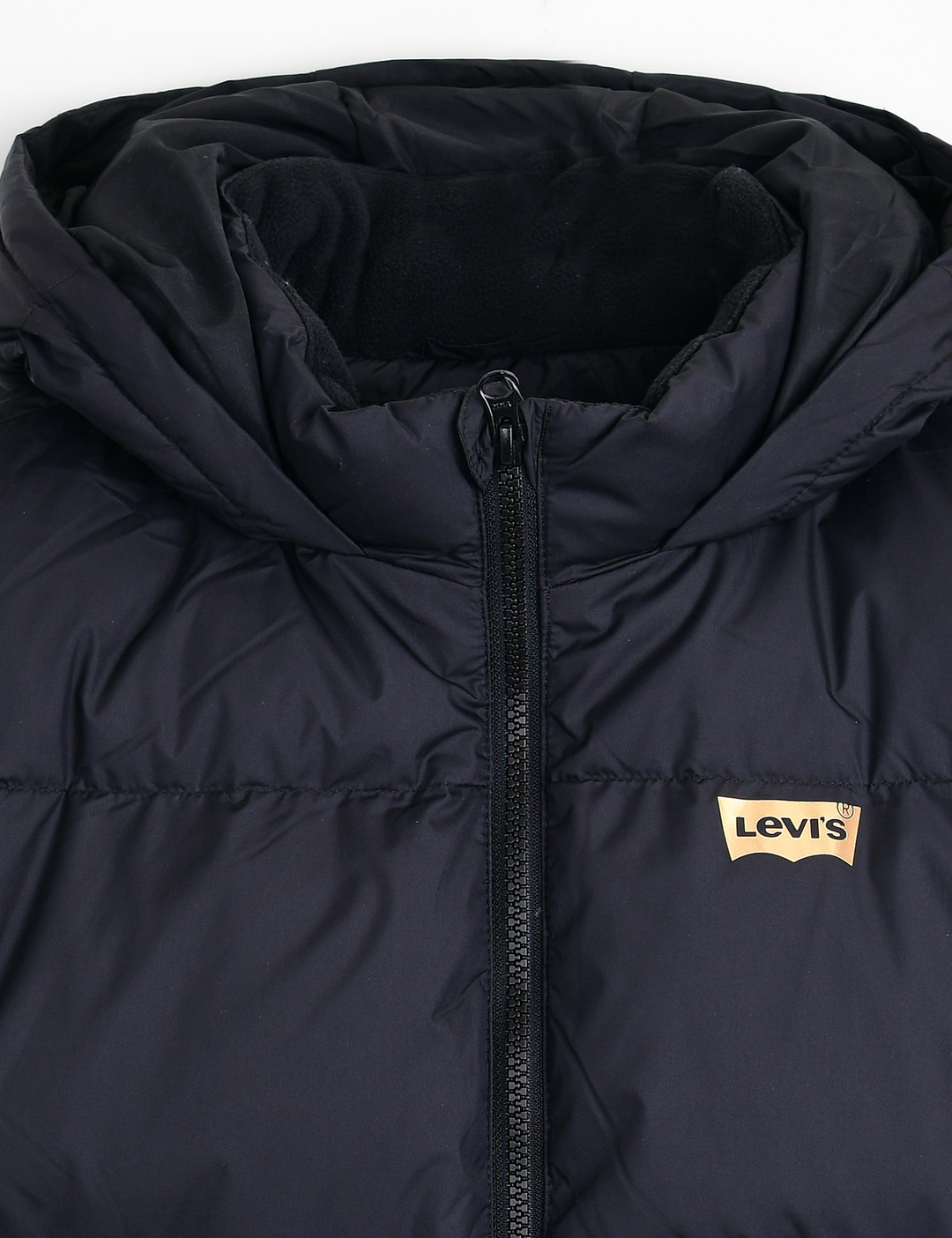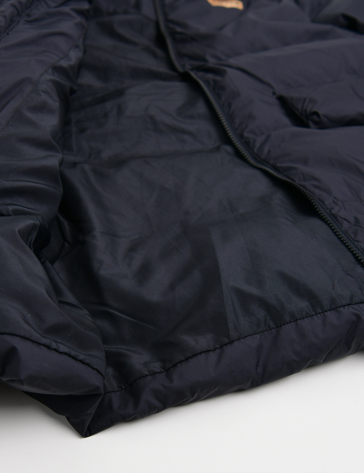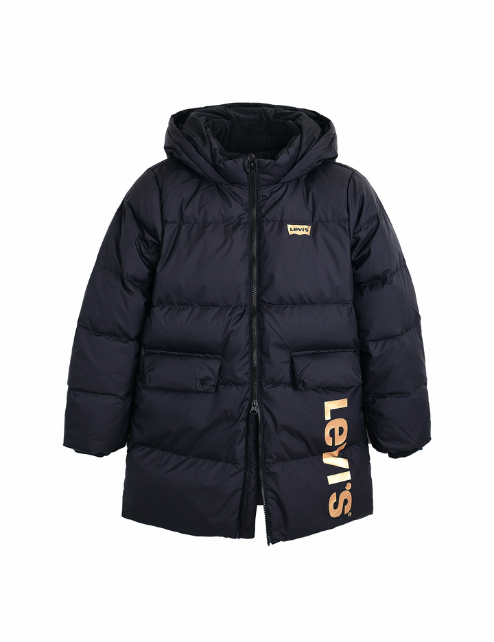 가슴의 배트윙 로고와 세로로고가골드 칼라로 들어가 있으며, 안감칼라가 포인트로 들어간 긴 기장의다운 자켓