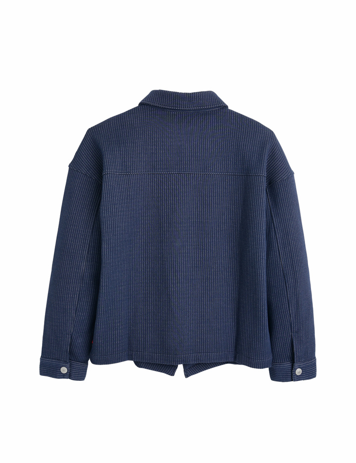 스냅단추로 착용이 편리하며, 가슴에 패치와 언발란스한 앞단 라인이 포인트인 부드러운 소재의 셔츠형 자켓