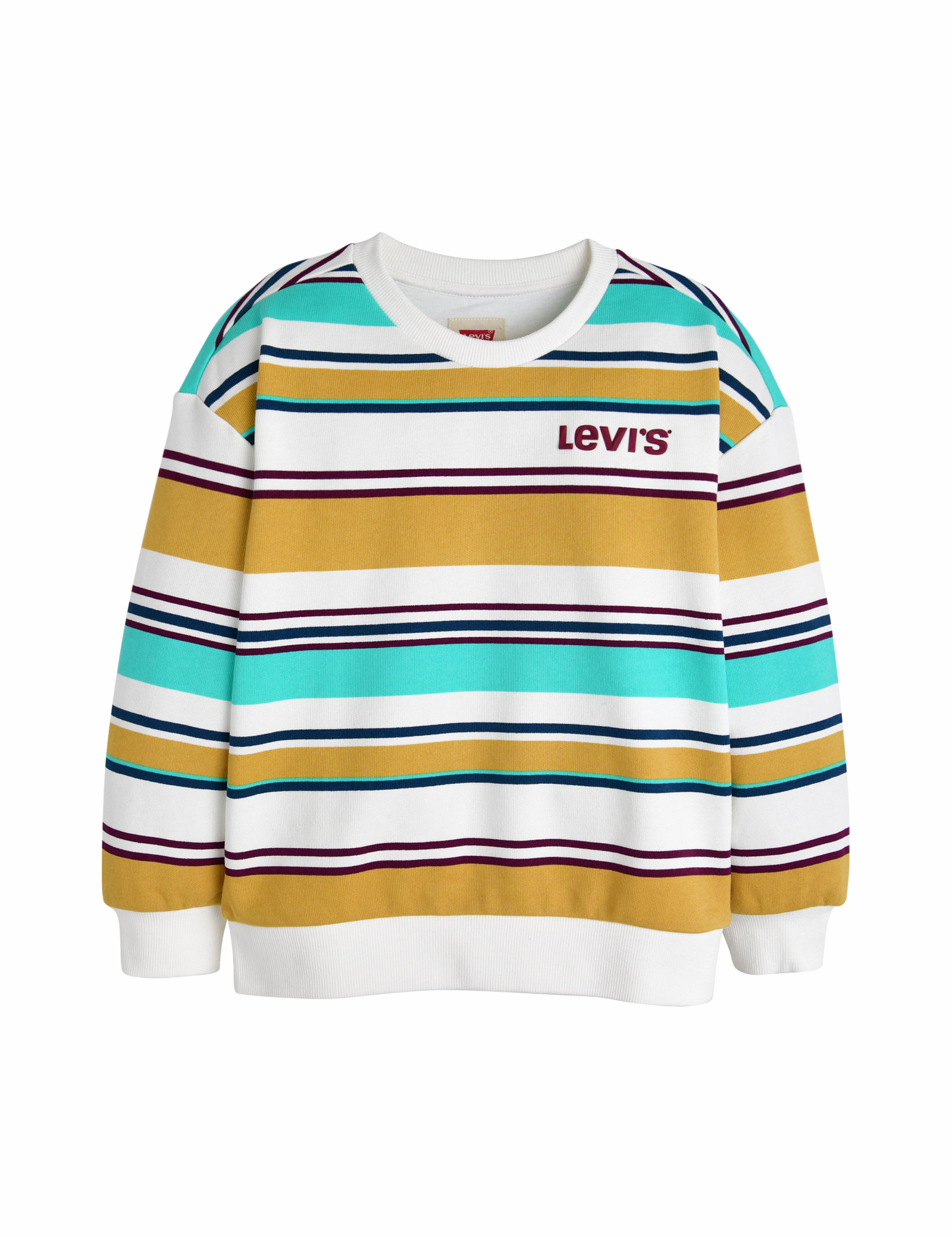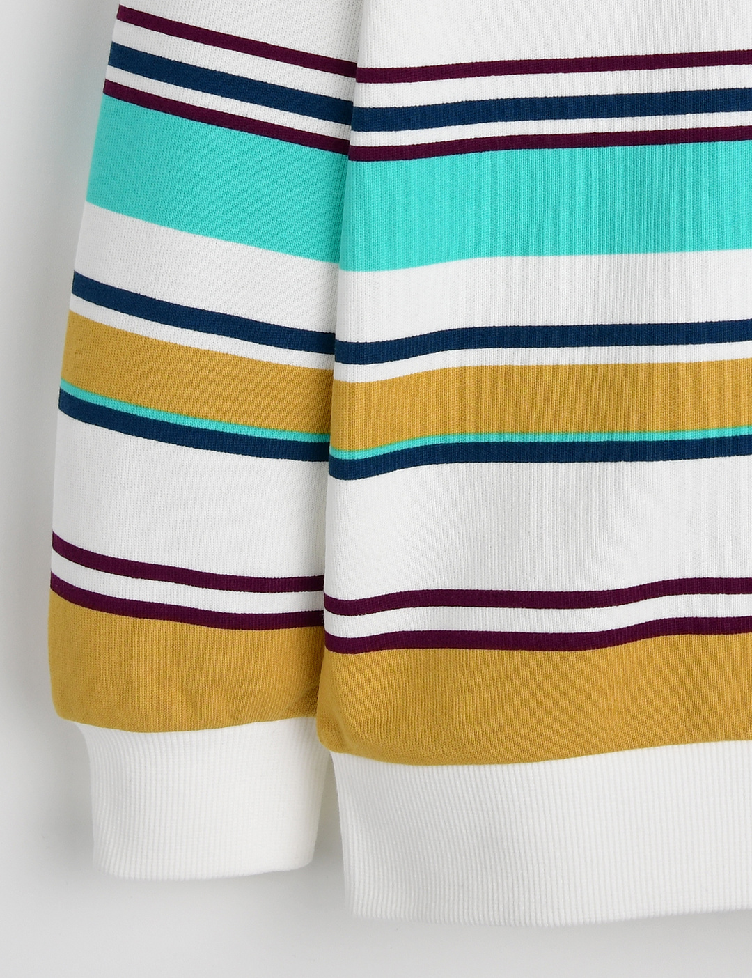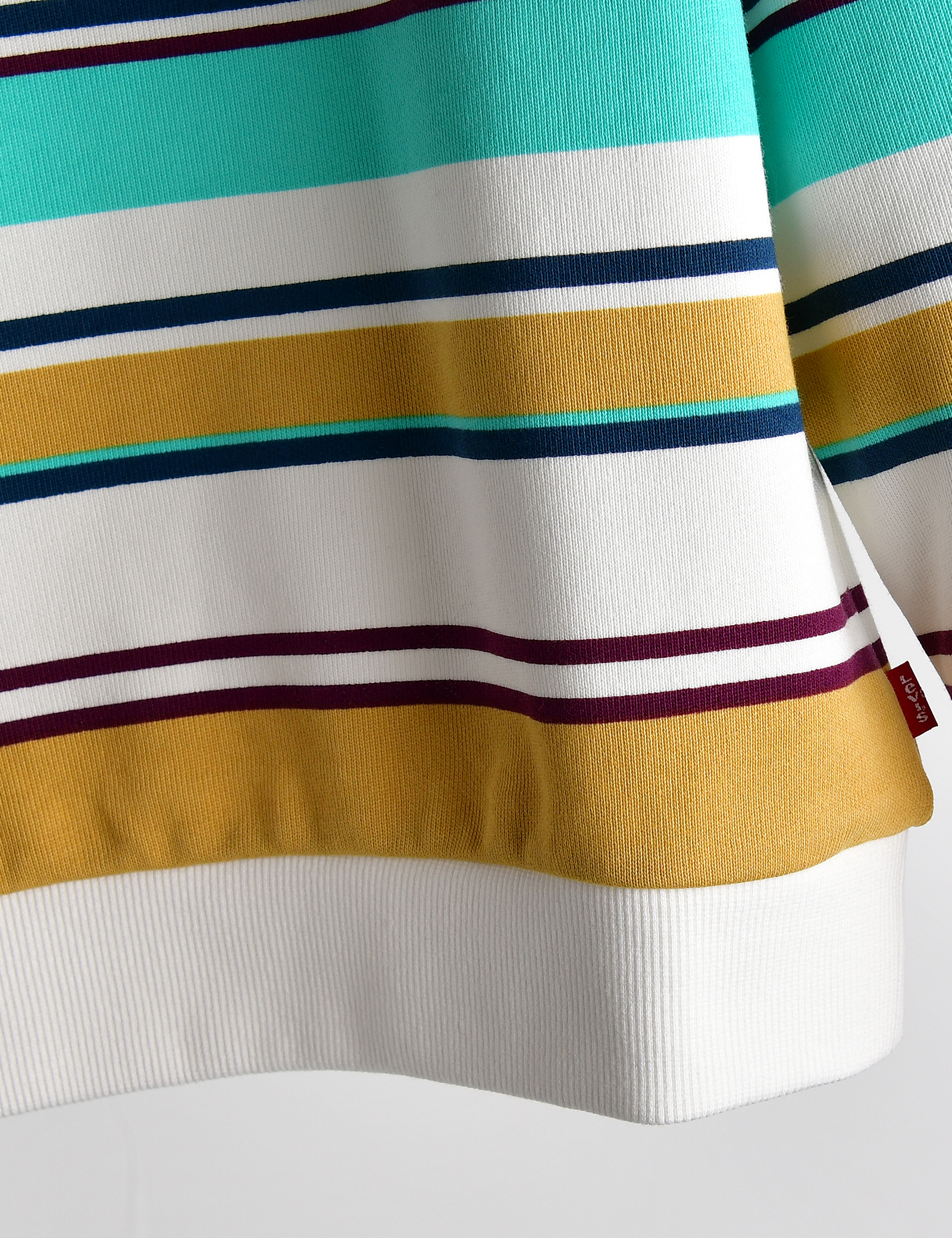 다양한 컬러의 스트라이프 패턴이전체적으로 들어가 있으며, 가슴 부분에 자수 로고로 포인트를 준 풀오버