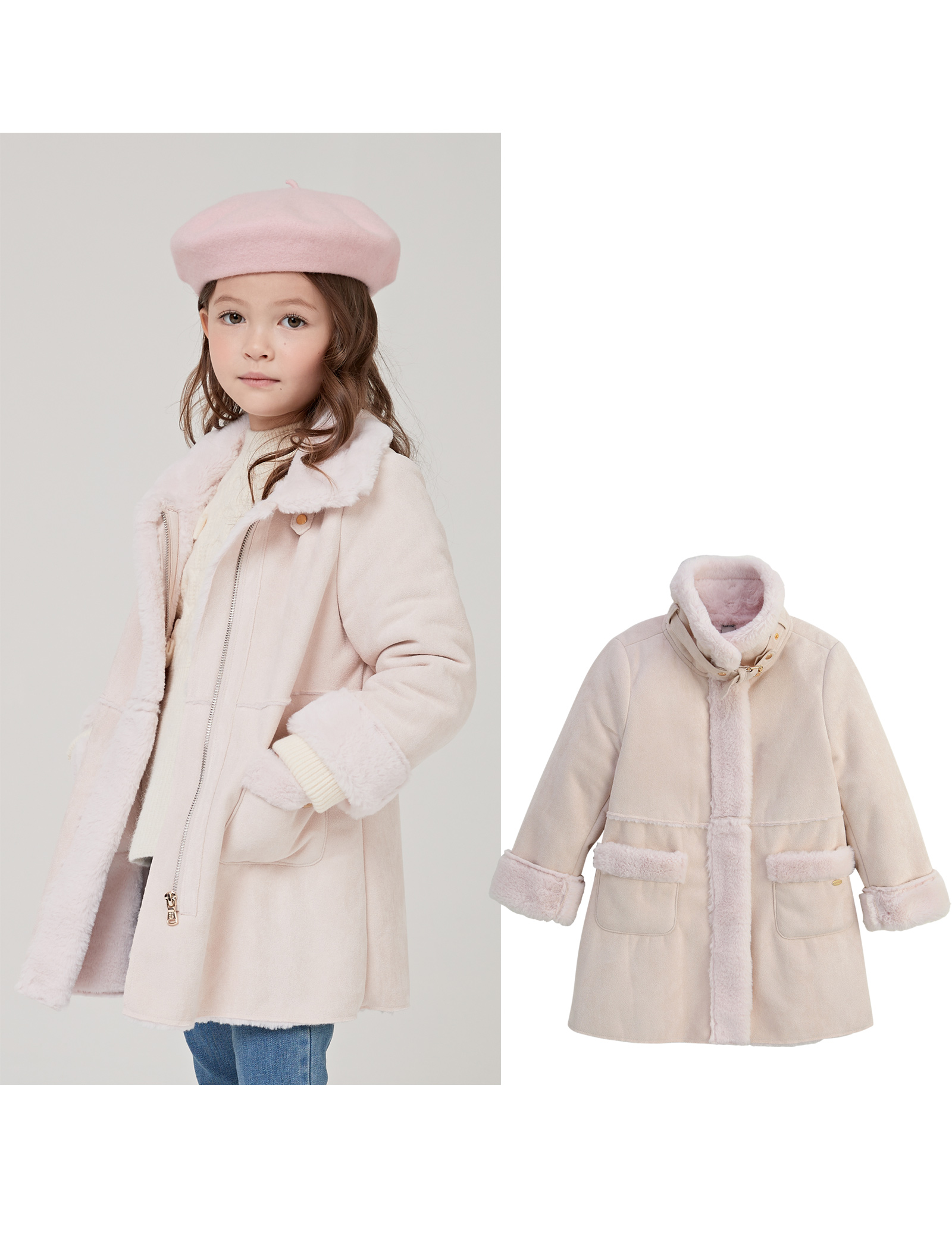 연한 핑크 컬러가 사랑스러운 여아 무스탕입니다. 스웨이드에 랏셀열풍퍼를 본딩하여 부드럽고 따뜻합니다. 목 부분에 탈착이 가능한 비조 끈이 있어 목을 감싸주는 스탠딩 카라로도 입을 수 있습니다.목부분 비조끈 탈부착 가능합니다.