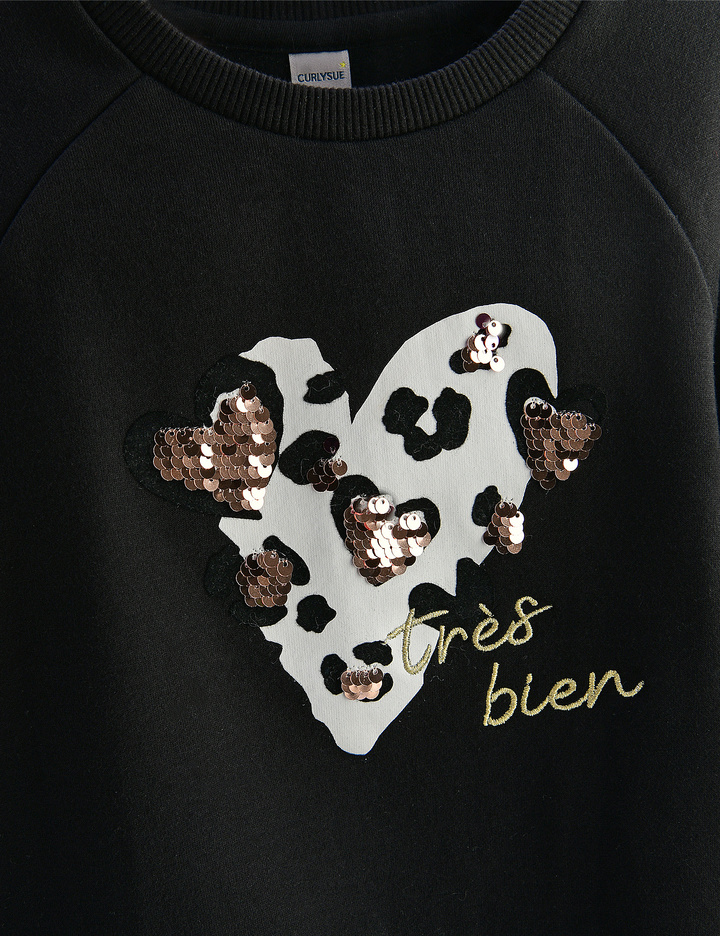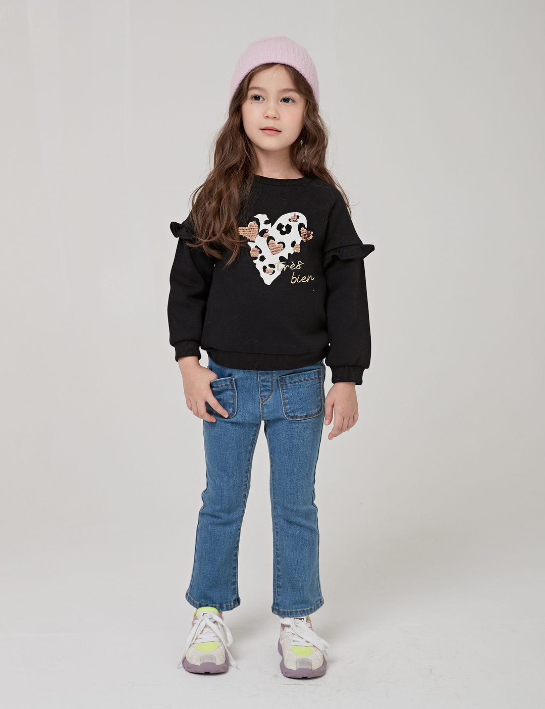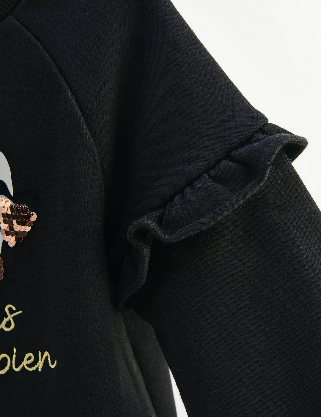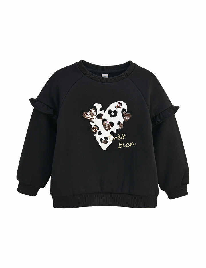 소매에 짧은 프릴이 달린 귀여운 맨투맨입니다. 안쪽이 기모로 되어있어 따뜻하게 입을 수 있습니다. 블랙 컬러에는 양면 스팽글로 포인트를 주었고, 코랄 컬러에는 체인 자수와 밍크 폼폼이로 포인트를 주었습니다.
