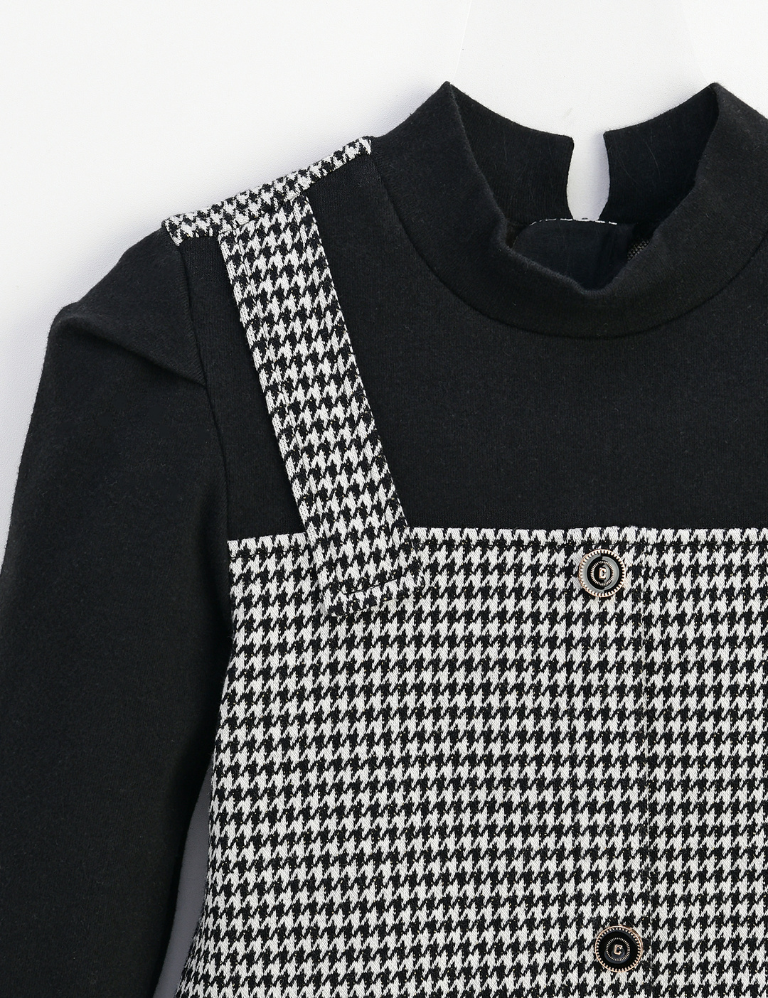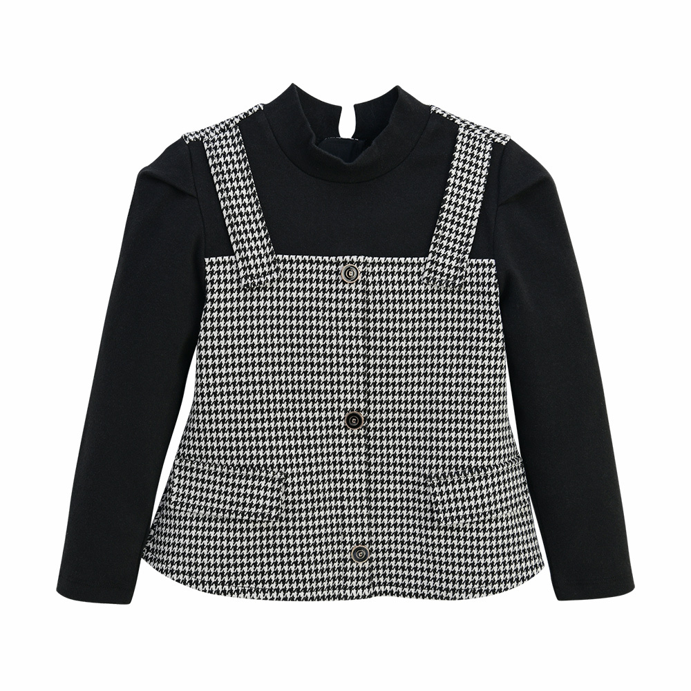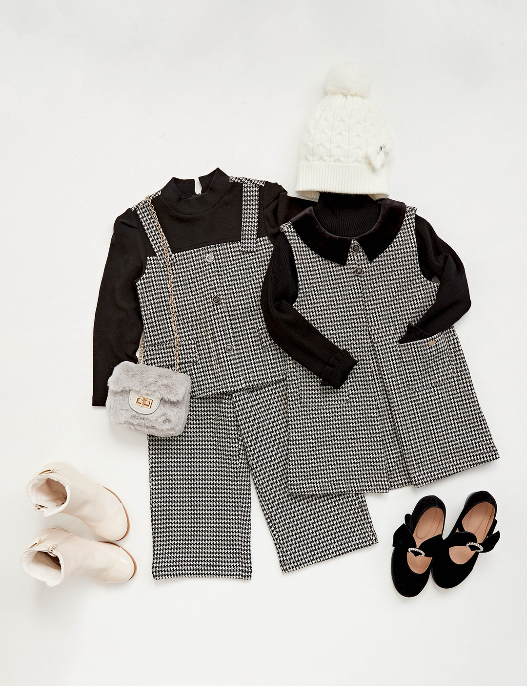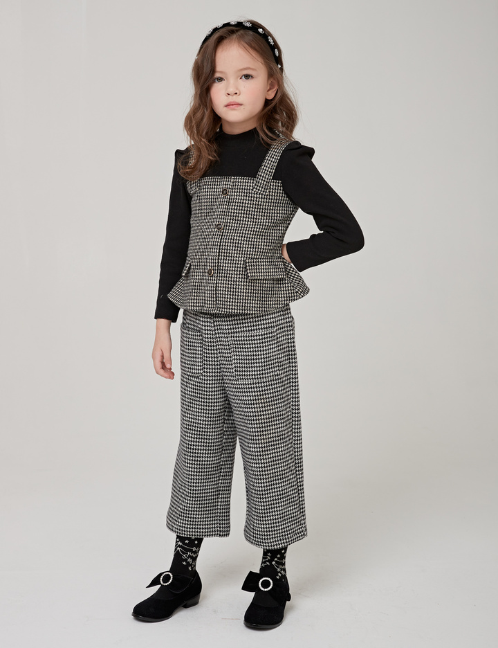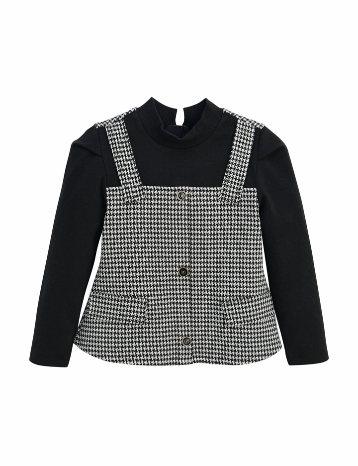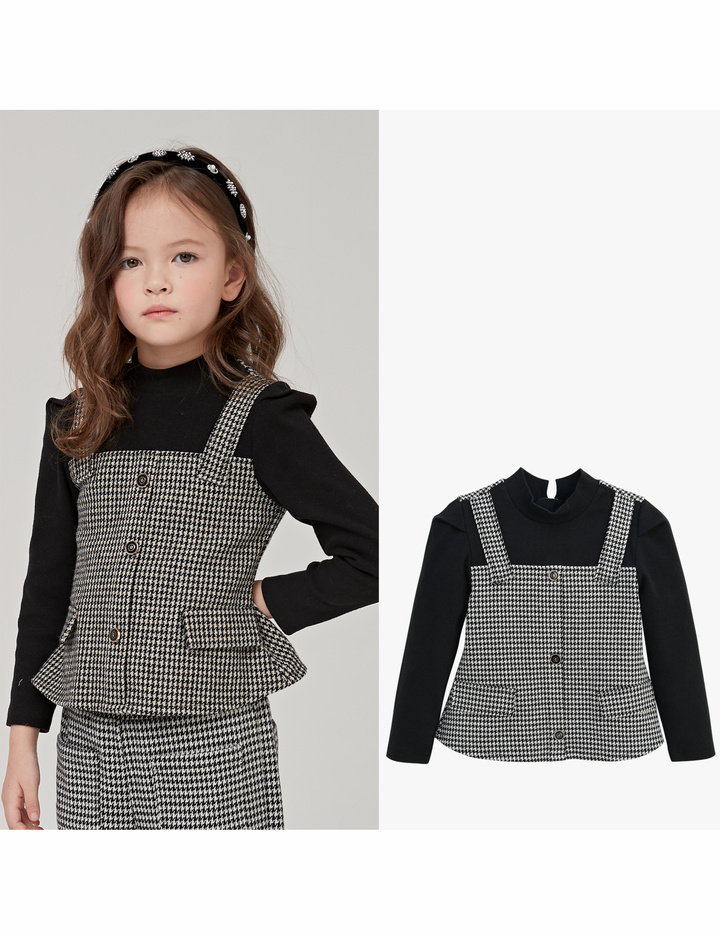 두 가지를 입은 듯한 여아 레이어드 티셔츠입니다. 클래식한 하운드투스 자카드 패턴과 고급스러운 에폭 단추로 포인트를 주었고, 같은 패턴의 와이드팬츠와 셋업 코디 추천드립니다.