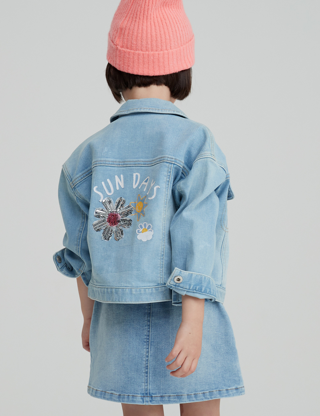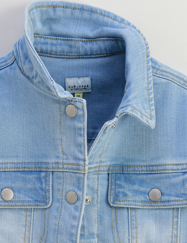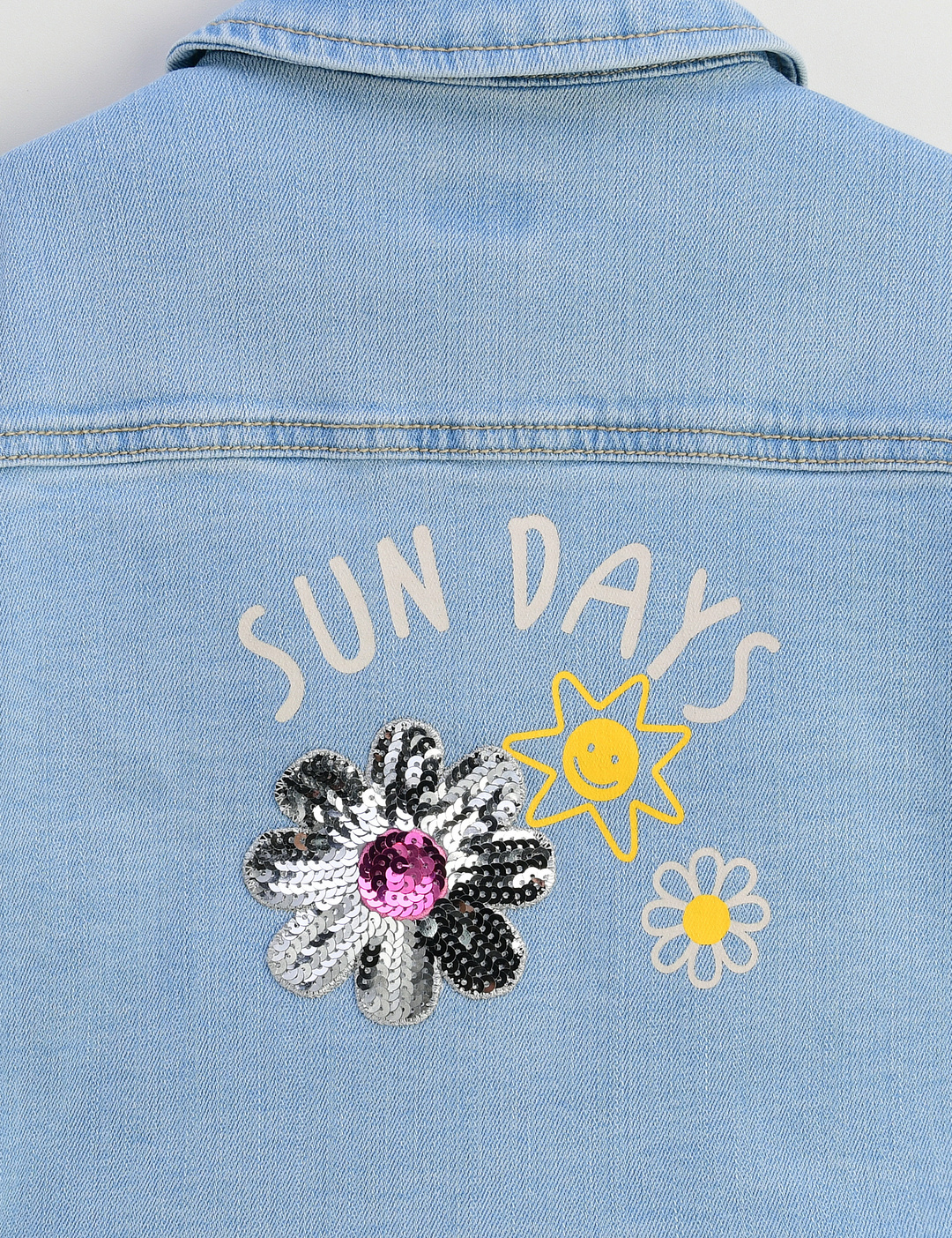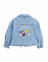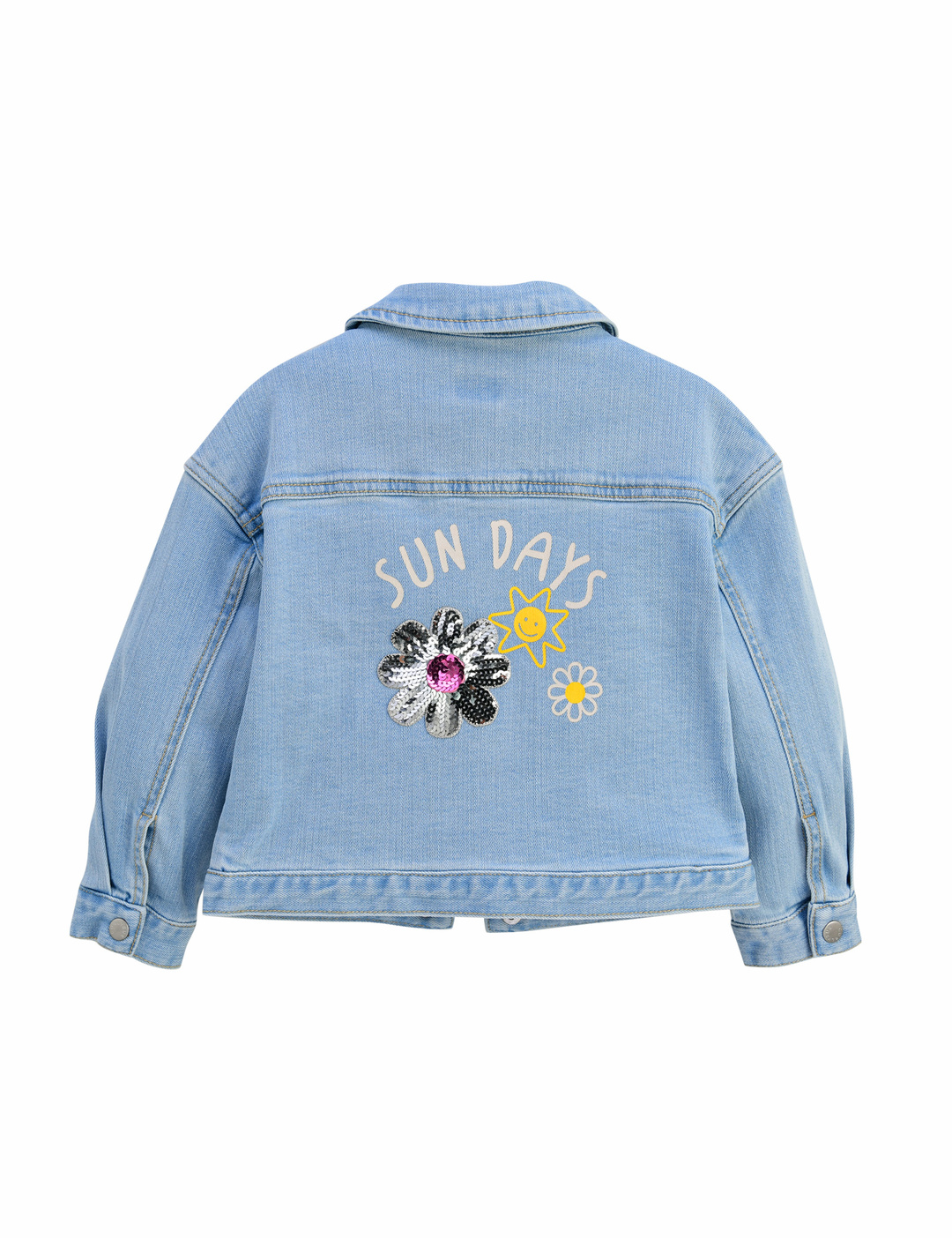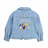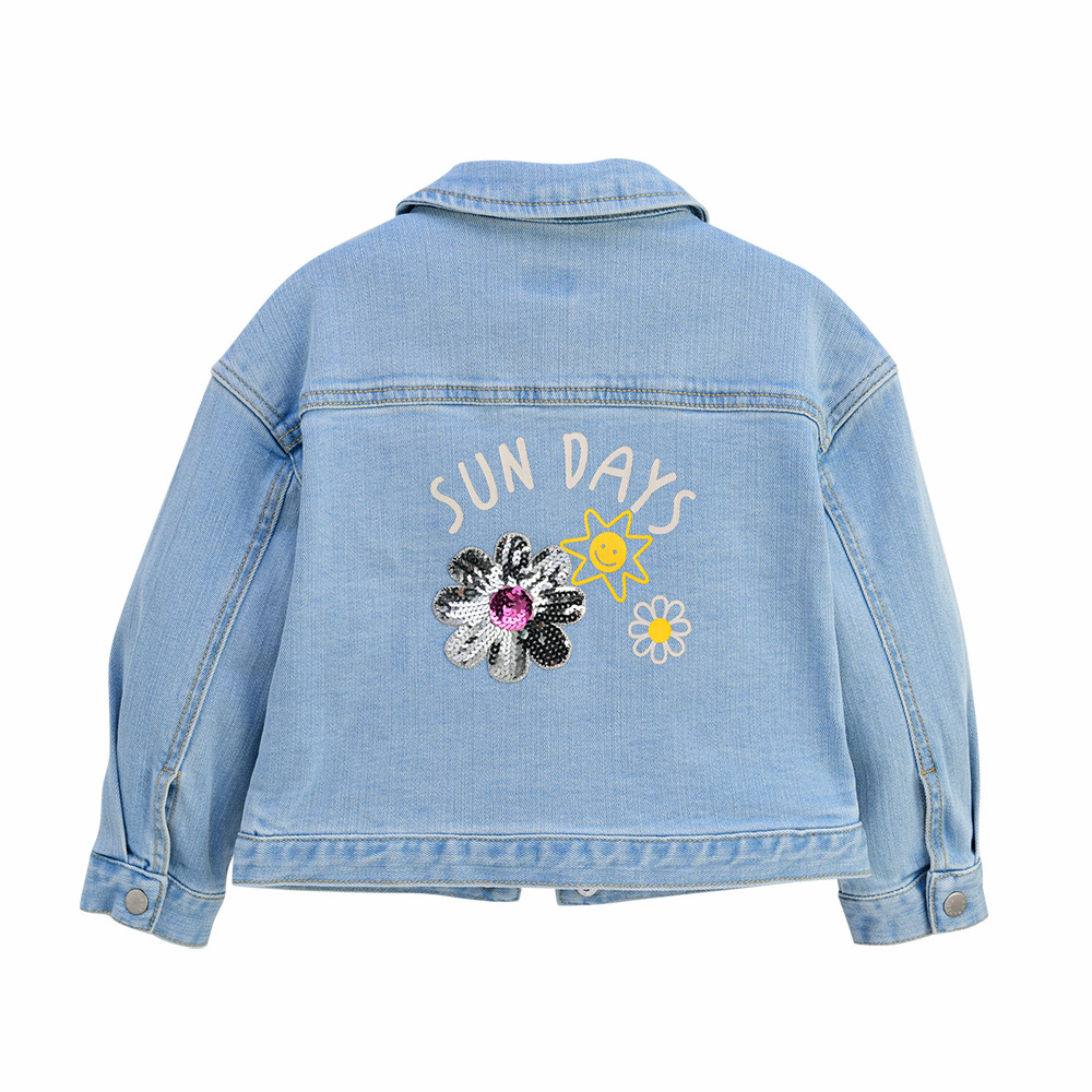 캐주얼하게 간절기에 걸치기 좋은 여유 있는 핏 감의 예쁜 데님 재킷입니다. 등판에 반짝이는 꽃 스팽글 와펜과 귀여운 나염이 찍혀있어 포인트가 됩니다.