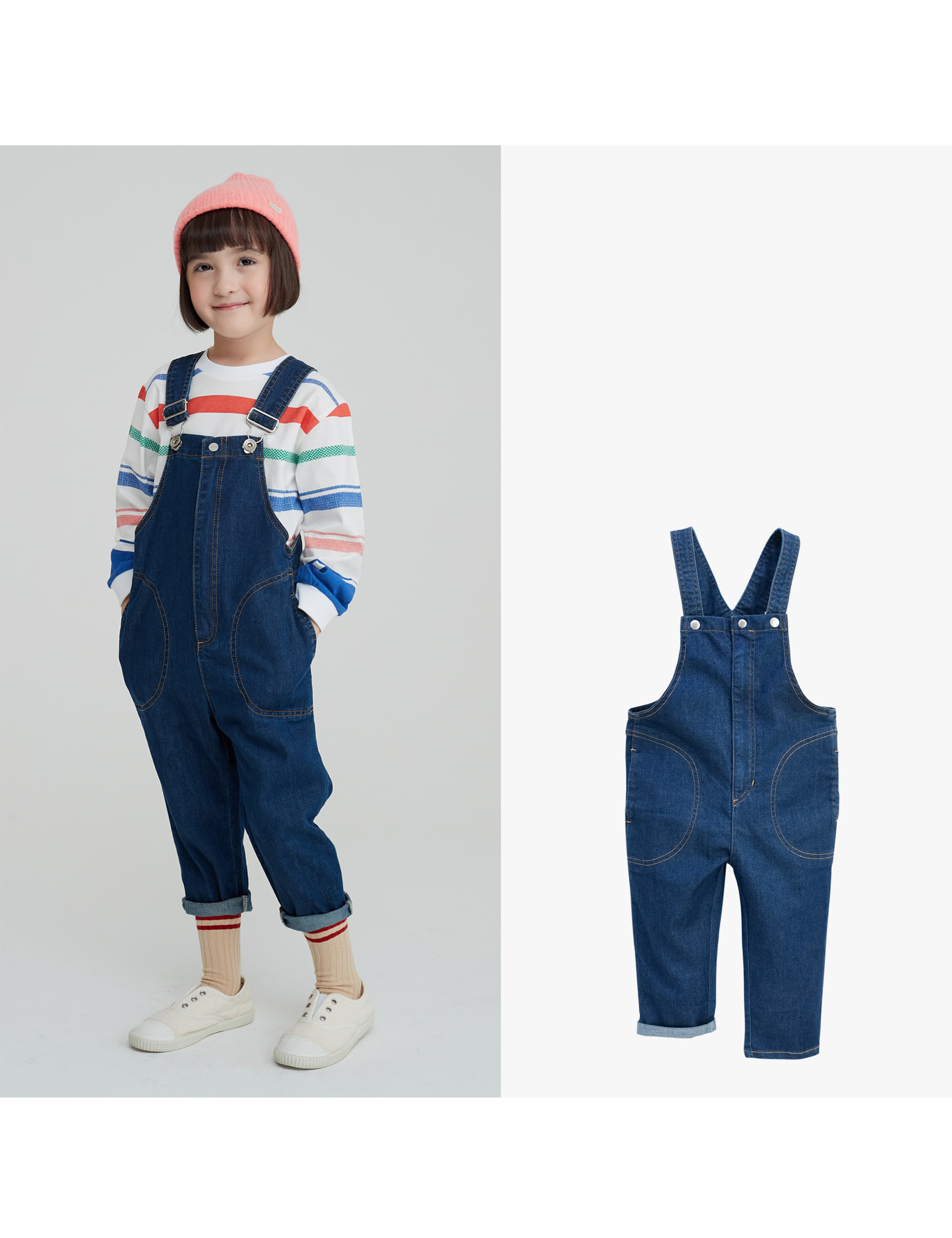 스트라이프 티셔츠와 코디를 추천드리며 입었을 때 캐주얼하게 너무 귀여운 오버롤 데님 팬츠입니다. 저온스 데님에 스판력이 있어서 활동하기 편안한 핏으로 설계하였습니다.