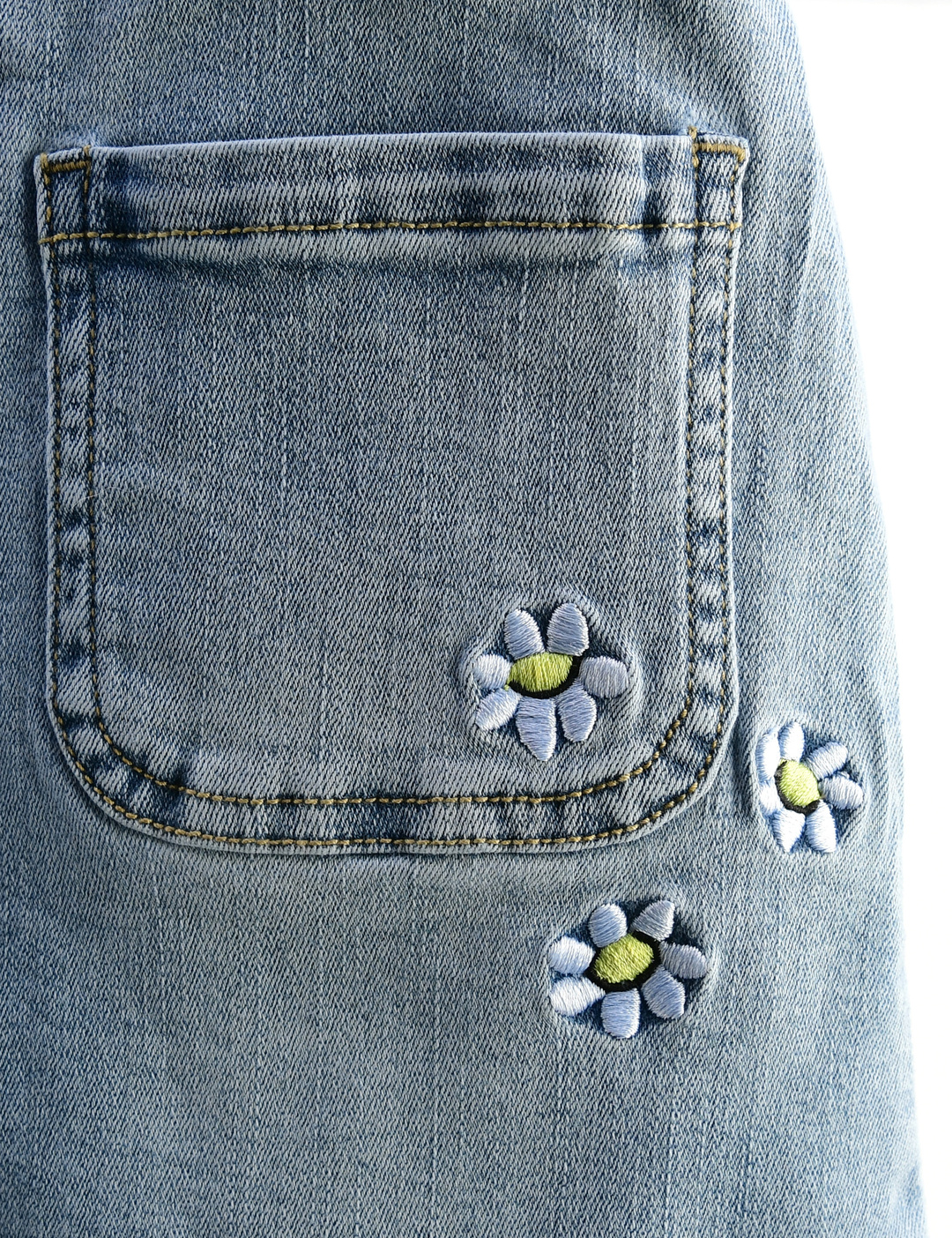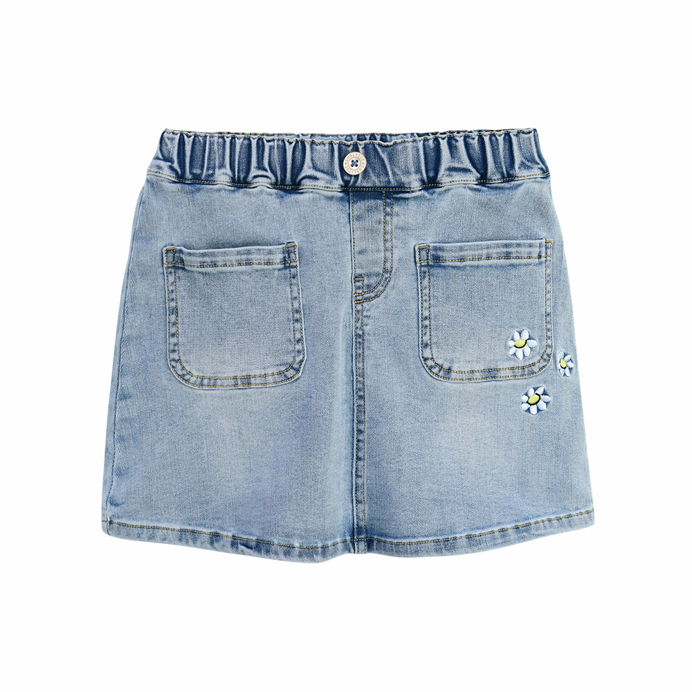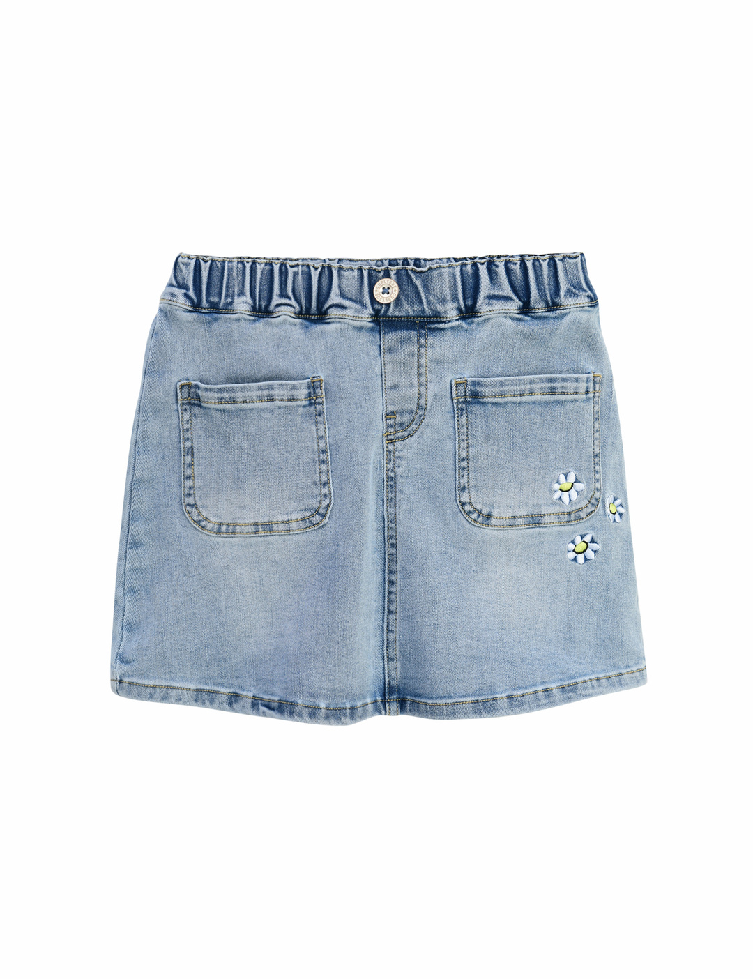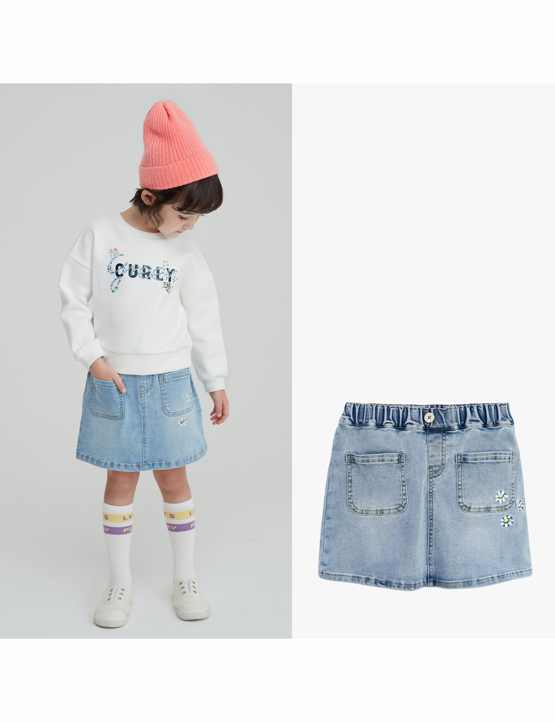 귀여운 꽃자수가 포인트인 데님 스커트입니다. 세미 A 라인에 신축성이 좋아 편안하게 입을 수 있습니다.