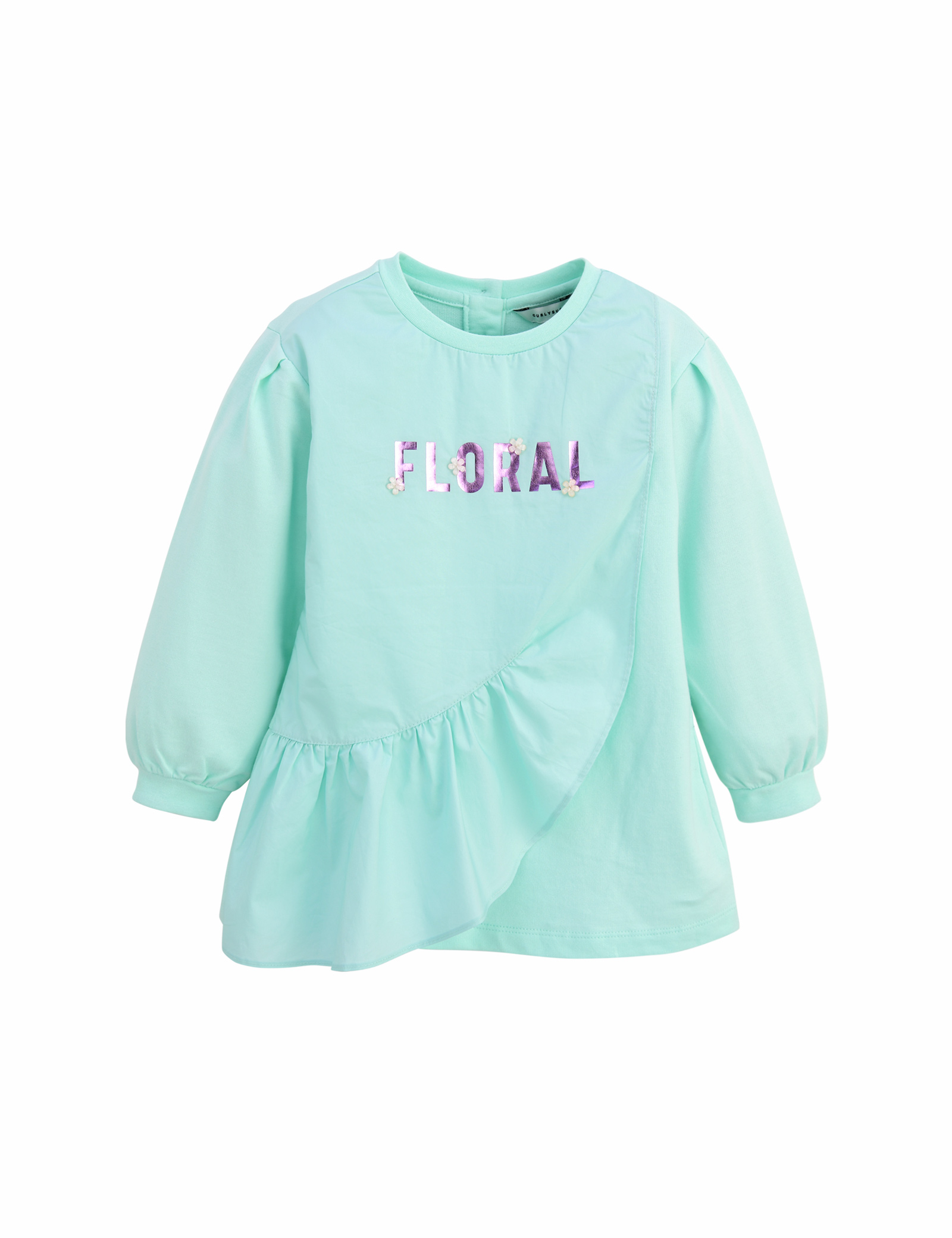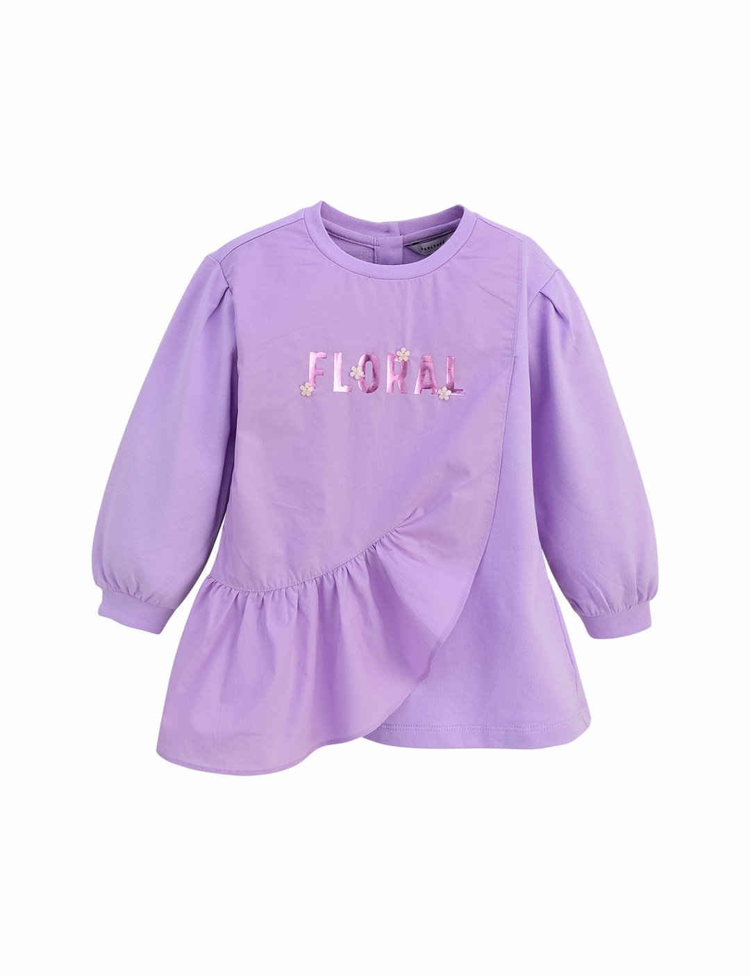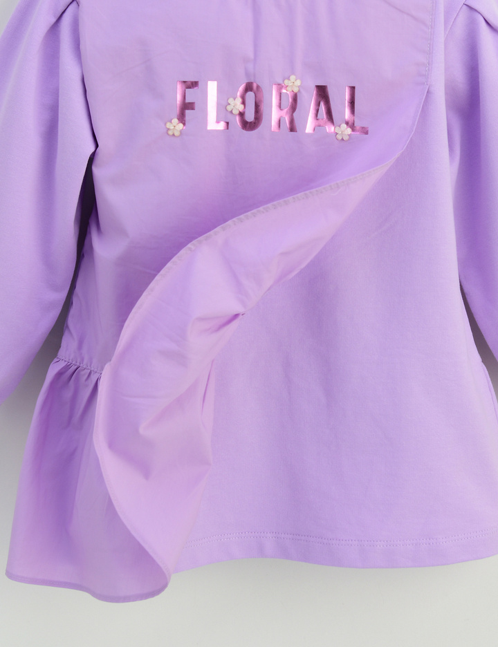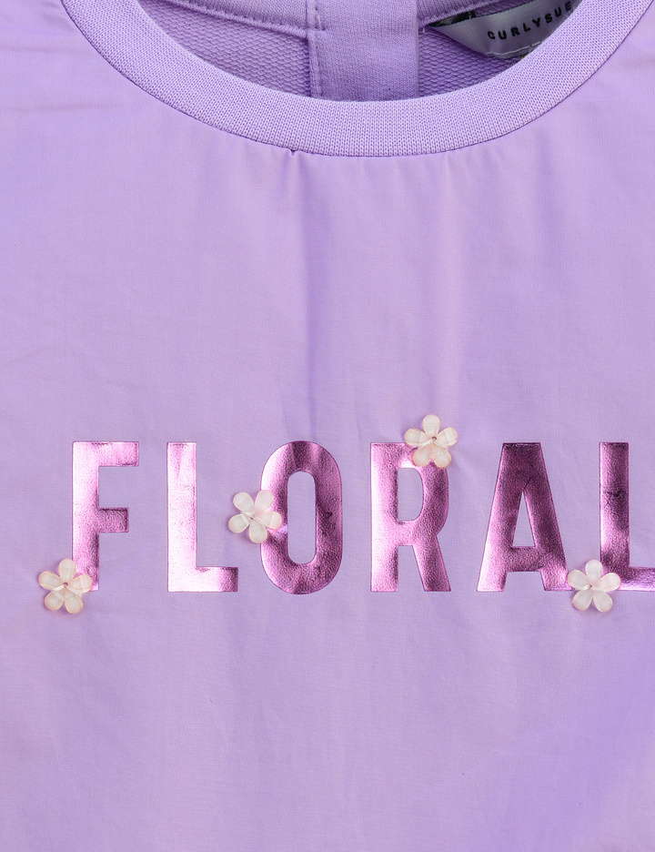 언밸런스한 우븐 프릴 배색이 사랑스러운 롱 티셔츠입니다. 살짝 A 라인으로 퍼져 레깅스나 스키니 팬츠에 매치하여 예쁘게 입을 수 있습니다. 반짝이는 호일 나염과 꽃 장식 모티브로 포인트를 주었습니다.