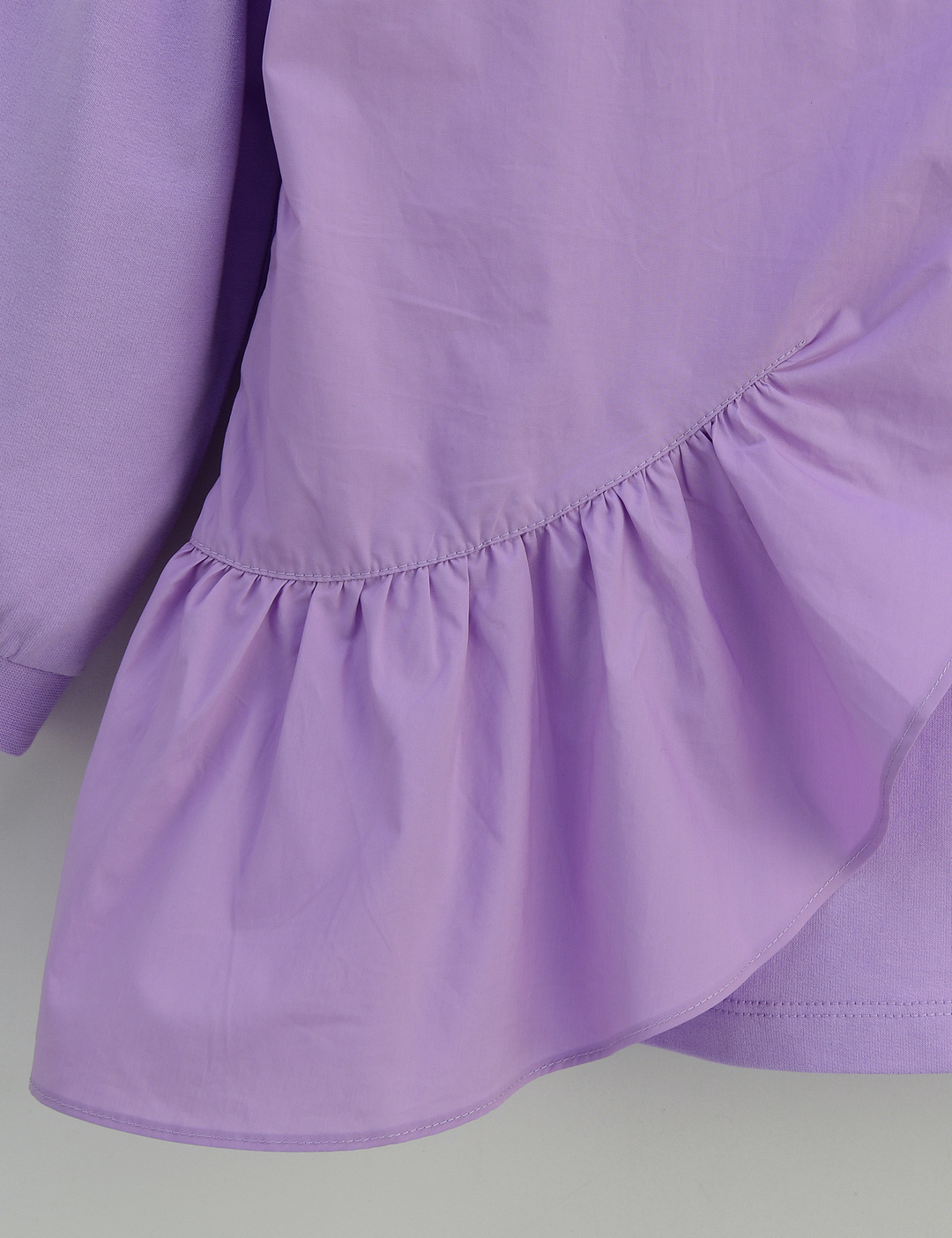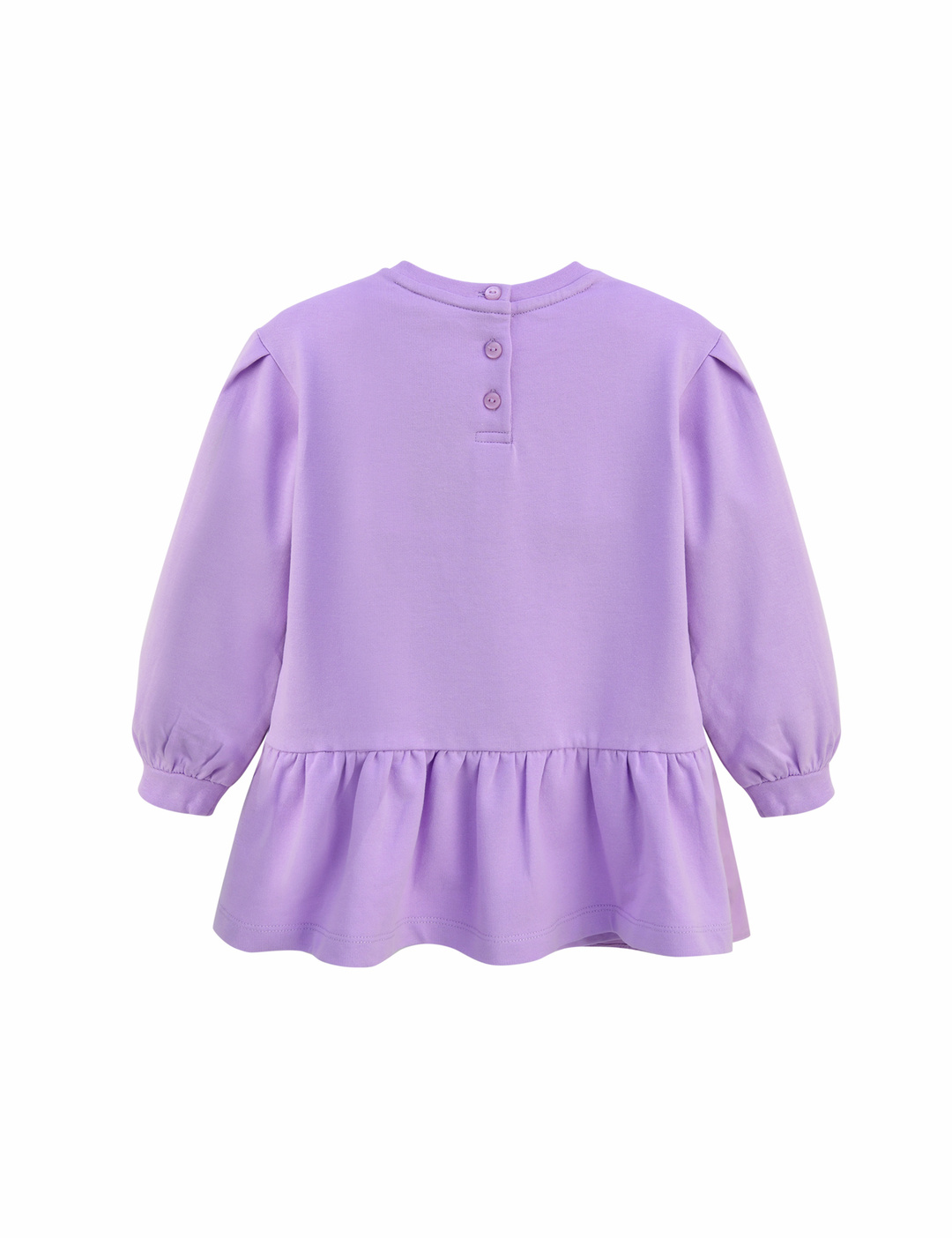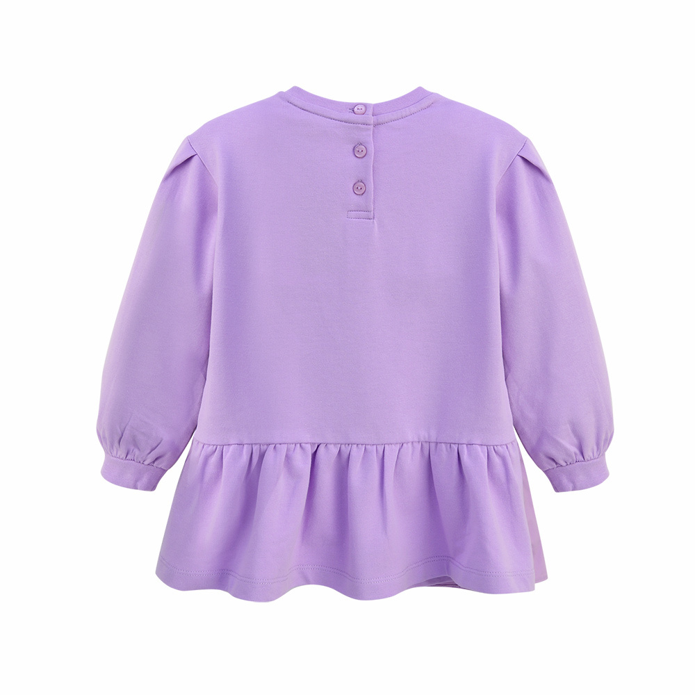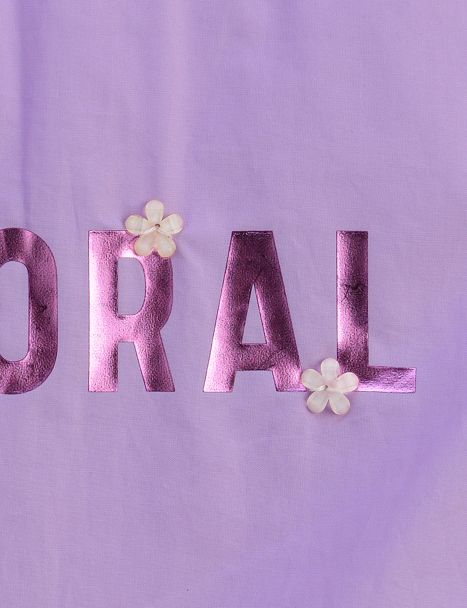 언밸런스한 우븐 프릴 배색이 사랑스러운 롱 티셔츠입니다. 살짝 A 라인으로 퍼져 레깅스나 스키니 팬츠에 매치하여 예쁘게 입을 수 있습니다. 반짝이는 호일 나염과 꽃 장식 모티브로 포인트를 주었습니다.